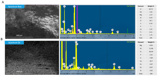 The percentage of chemical elements (from highest to lowest) in Bca and Ze was calculated based on the X-ray spectral microanalysis by the scanning electron microscope. The calcium bentonite (Bca) detected the O, S, Al, Ca, Fe, Na, Mg, K, T, and S, and the zeolite (Ze) detected the Si, Al, Ca, K, Sr, Fe, P, Mg, and Zn (Figure 2A,B).