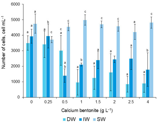 Number of cells of G. catenatum surviving during application of calcium bentonite, diluted in distilled water (DW), deionized (IW), and seawater (SW). Bars (0) are the control treatment. Significant differences between dilutions are indicated with letters a, b, and c (α = 0.05).
