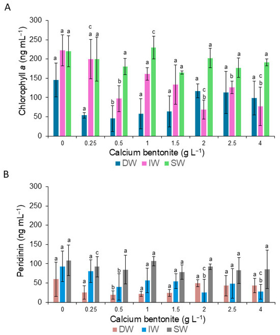 Variation in the content of chlorophyll a (A) and peridinin (B) of cells of G. catenatum during the application of calcium bentonite diluted in distilled water (DW), deionized water (IW), and seawater (SW). Bars (0) are the control treatment. Letter a signifies that there is no significant difference at a level of confidence of α = 0.05. Letters b and c indicate significant differences (α = 0.05), and data and error bars are shown as mean ± SD.