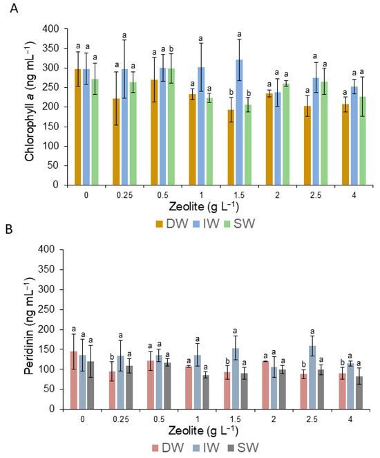 Variation in the content of chlorophyll a (A) and peridinin (B) of the surviving cells of G. catenatum during the application of zeolite. Bars (0) are the control treatment. Letter a means no significant differences (α = 0.05), and letter b means that there were significant differences (α = 0.05), and data and error bars are shown as mean ± SD.