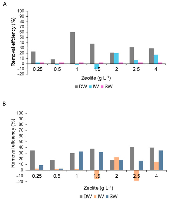 The highest values of RE% relative to the number of cells were 78.7% and 72.6% with a dilution of 1.0 and 2.5 gL−1 of Bca in DW, respectively. Following in descending order, when diluted in water with 0.5 and 4.0 gL−1 of IW, the RE% was 56.0 and 59.0%, respectively. Dilutions less efficient (<15.0%) were with SW (Figure 7A). The zeolite with the three treatments showed a low removal process of <40.0% (Figure 7B).