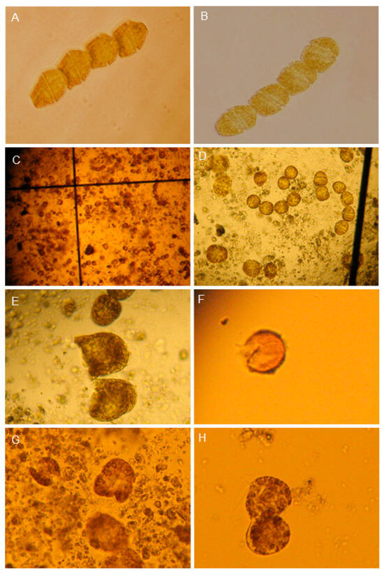 Micrographs of G. catenatum during bentonite application diluted in distilled water. (A,B) Control showed normal chain cells (10×). (C,D) Single cells and chain-deformed cells (5×). (E) Dead cells (10× magnification). (F) Temporary cyst, open (10×). (G,H) Lysis cells are observed in a matrix, and flocculated cells and some calcium bentonite clay particles are attached to the cell wall (10×).