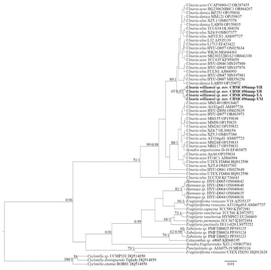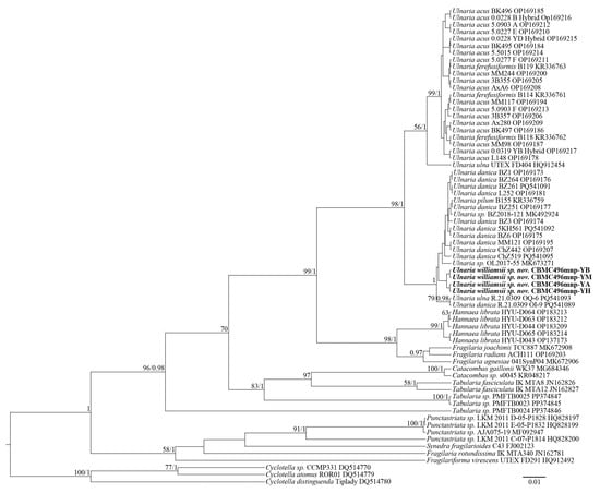 Thus, the SSU rDNA and rbcL phylograms show similar results. Most importantly, the representative strains of Ulnaria form an extensive group, which also includes new strains of Ulnaria williamsii sp. nov. Other species of the genus, i.e., Ulnaria acus, Ulnaria danica, and Ulnaria ulna, require further molecular studies to determine their phylogenetic relationships. Inter-connections between the rest of the araphid genera represented are hardly resolvable through our analysis, too, mostly because of the small size of the matrices and scarcity of representation of the largest genera, i.e., Fragilaria and Tabularia.