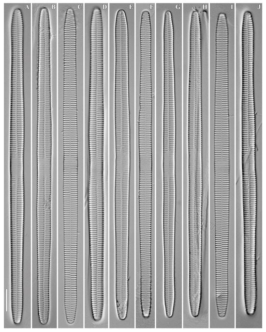 Description. LM (Figure 3 and Figures S1–S3). Valves linear, with parallel margins, moderately tapering towards the apices. Valve ends wedge-shaped and broadly rounded to obtusely rostrate. Valve length 54–337 µm, width 5.5–7.3 µm in the central portion. Sternum well expressed, narrow, linear in shape. Central area variable, rectangular to elliptic, delimited by shortened striae on each side. Central area with clearly visible ghost striae. Striae 11–13/10 µm, located mostly parallel throughout the valve, becoming slightly radiate near the apices. Each valve end bears a single rimoportular opening.