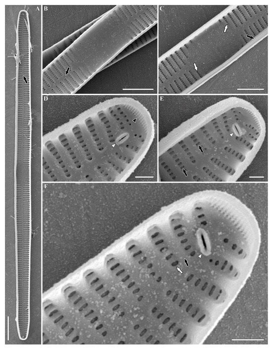 SEM, internal view (Figure 6 and Figures S10–S12). Valvocopulae tightly pressed towards the inner valvar surface (Figure 6C, black arrow). Sternum narrow, linear (Figure 6A,B and Figures S10A,B, S11A,B and S12A,B, black arrows). Virgae (Figure 6F and Figures S10D, S11C and S12C, black arrows) raised above the narrower vimines (Figure 6F and Figures S10D, S11C and S12C, white arrows). Vimines slightly tapering towards the sternum. The outer siliceous plaques are visible through the openings of areolae (Figure 6E, black arrows). Internally, central area is furnished by shallow transapical depressions, which correspond to ghost striae in LM (Figure S11B, white arrows). Sometimes, the central area is bordered by shortened striae or isolated areolae (Figure 6C and Figure S10B, white arrows). Isolated areolae are also notable in the marginal area against the central nodule (Figure S12C, white arrowhead). Valve apices equipped with ocellulimbi (Figure 6D and Figures S10C,D and S12D–G, black arrowheads). Sometimes, the surface of ocellulimbi is hidden by the valve margin at the apex (Figure S11C,D, black arrowheads). Rimoportulae simple, well discerned, with inner aperture formed by two lips, typically located beside the sternum and angled (45–180°) in relation to the apical axis of the valve (Figure 6D–F and Figures S10C,D, S11C,D and S12D–G, white arrowheads).