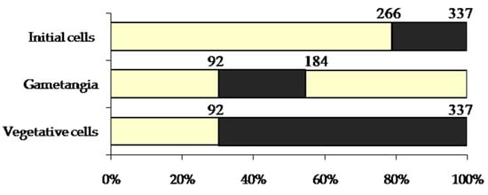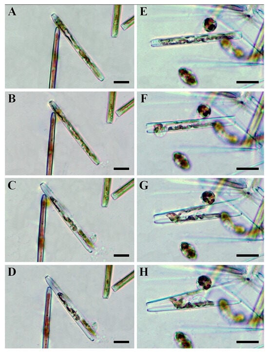 Each male and female gametangium produced two gametes. By the end of gametogenesis, the gametes were spherical and morphologically identical. However, the early stages of gametogenesis differed significantly between the sexes. In the male gametangium, the protoplast divided into two equal parts in the transapical plane (Figure 8A,B). Chloroplasts, which were arranged along the apical axis in vegetative cells, migrated to opposite ends of the gametangium. After the rearrangement of the chloroplasts was completed, a septum was formed, separating the gametes (Figure 8C,D). During the early stages, male gametes were rod-shaped with rounded ends. Later, the gametes sequentially rounded up, gradually became spherical, and—thereby pushing the gametangial valves apart—exited the gametangium (Figure 8F–H).