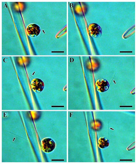The formation of cytoplasmic projections of male gametes in Ulnaria williamsii sp. nov., live material, LM, DIC. (A) The initial stage of gamete movement. (B) A gamete changing its shape during movement. (C–F) Male gametes with cytoplasmic projections. Black arrows indicate the cytoplasmic projections. Scale bars = 20 µm.