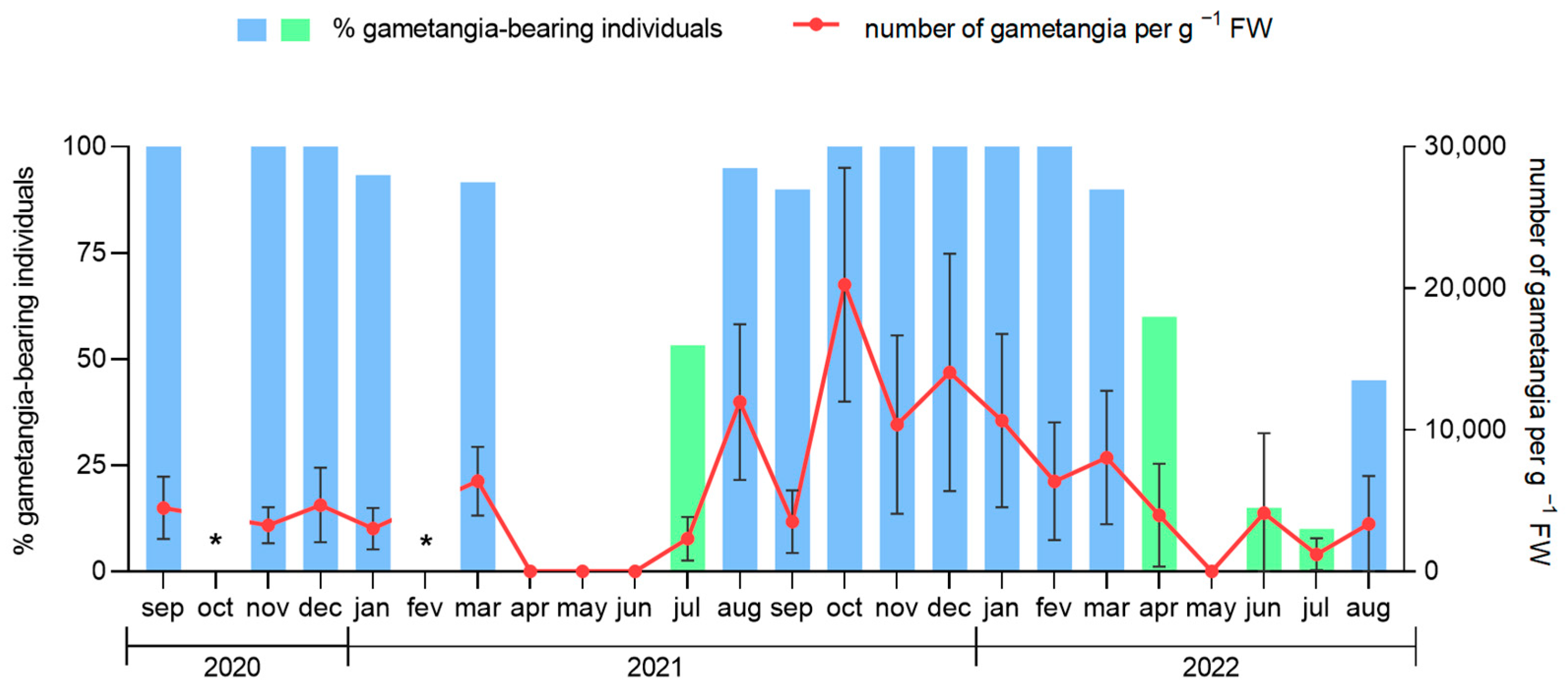 From August to March (late summer to late winter), 90% to 100% of individuals analyzed exhibited gametangia, except in August 2022, when only 45% were observed. On the other hand, during July 2021, April, June, and July 2022 (spring to early summer), only 10% to 60% of individuals bore gametangia, corresponding to a non-fertile period.