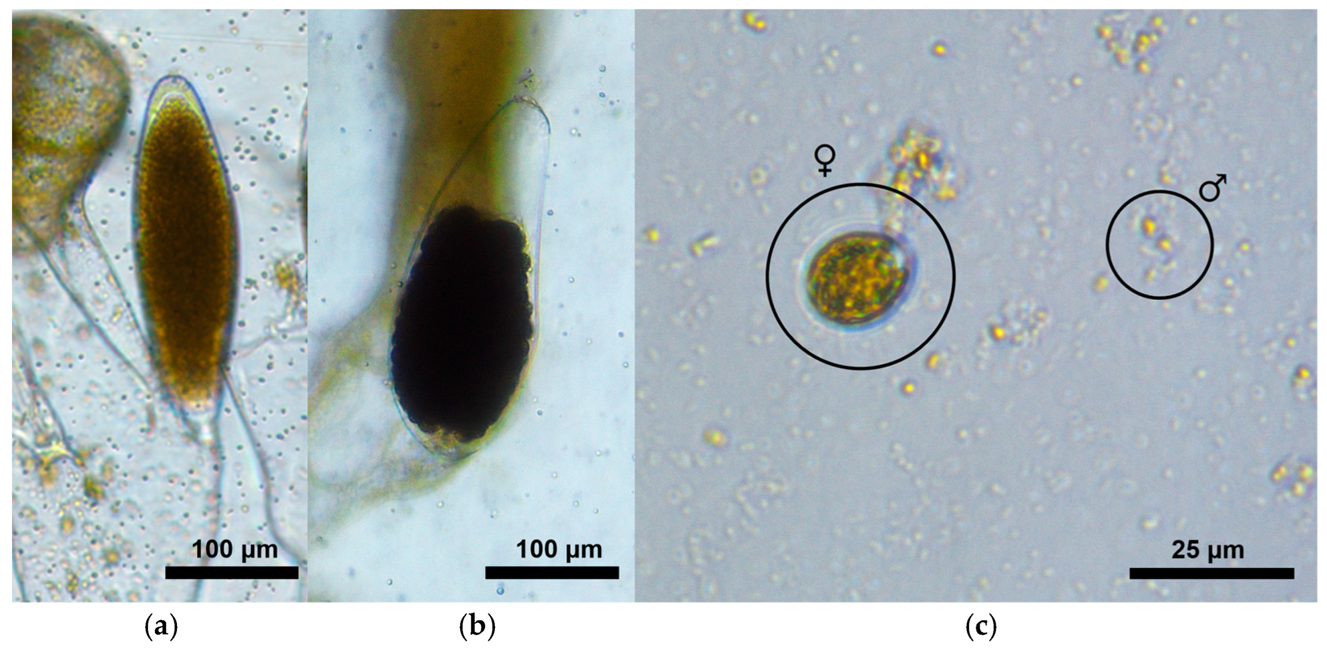 20. Miravalles, A.B.; Leonardi, P.I.; Cáceres, E.J. Female gametogenesis and female gamete germination in the anisogamous green alga Codium fragile subsp. novae-zelandiae (Bryopsidophyceae, Chlorophyta). Phycol. Res. 2012, 60, 77–85. [Google Scholar] [CrossRef]