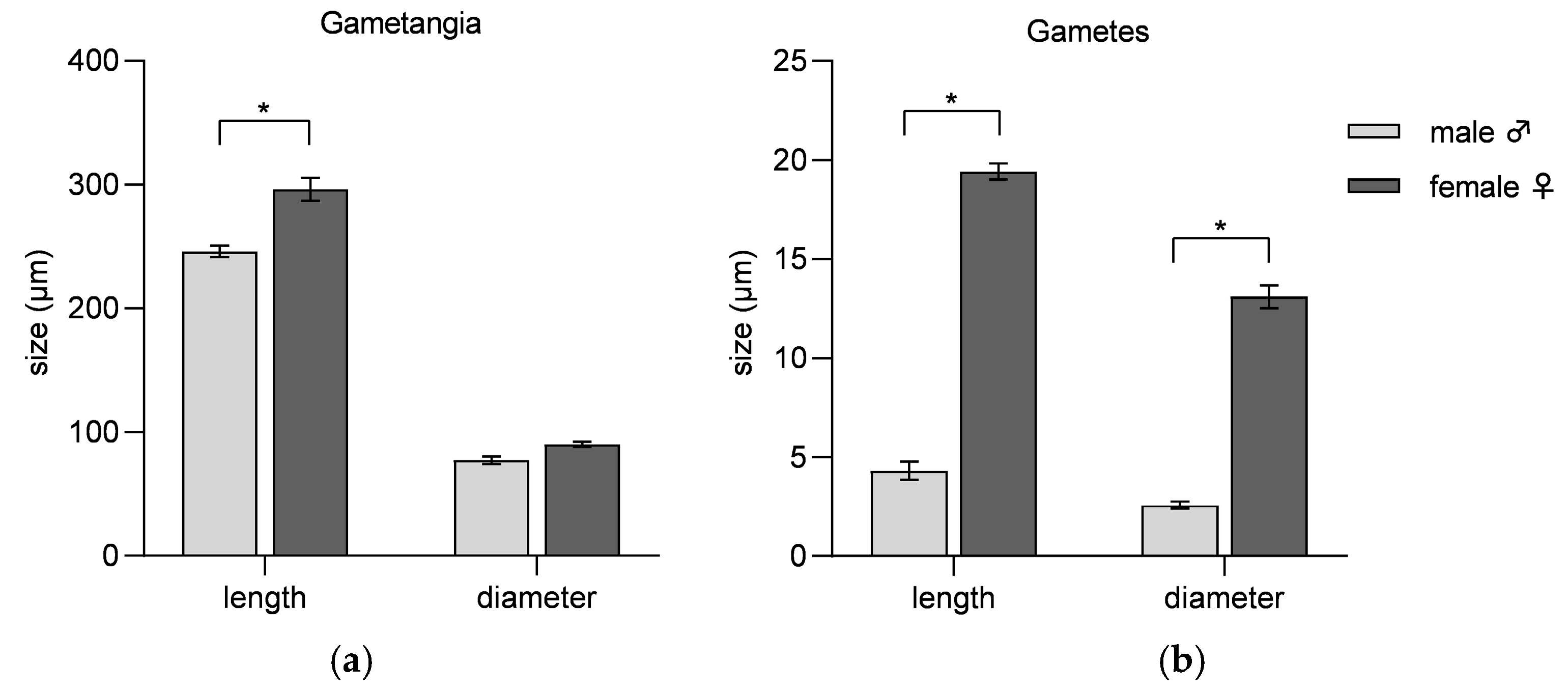 The mean length of male gametes was 4.32 ± 0.46 µm, with a mean diameter of 2.58 ± 0.19 µm (Figure 4b). Female gametes exhibited a mean length of 19.42 ± 0.40 µm and a mean diameter of 13.11 ± 0.60 µm (Figure 4b). Both the length and diameter of female gametes were significantly higher than those of male gametes (p < 0.0001), with female gametes being approximately 4.5 times longer.
