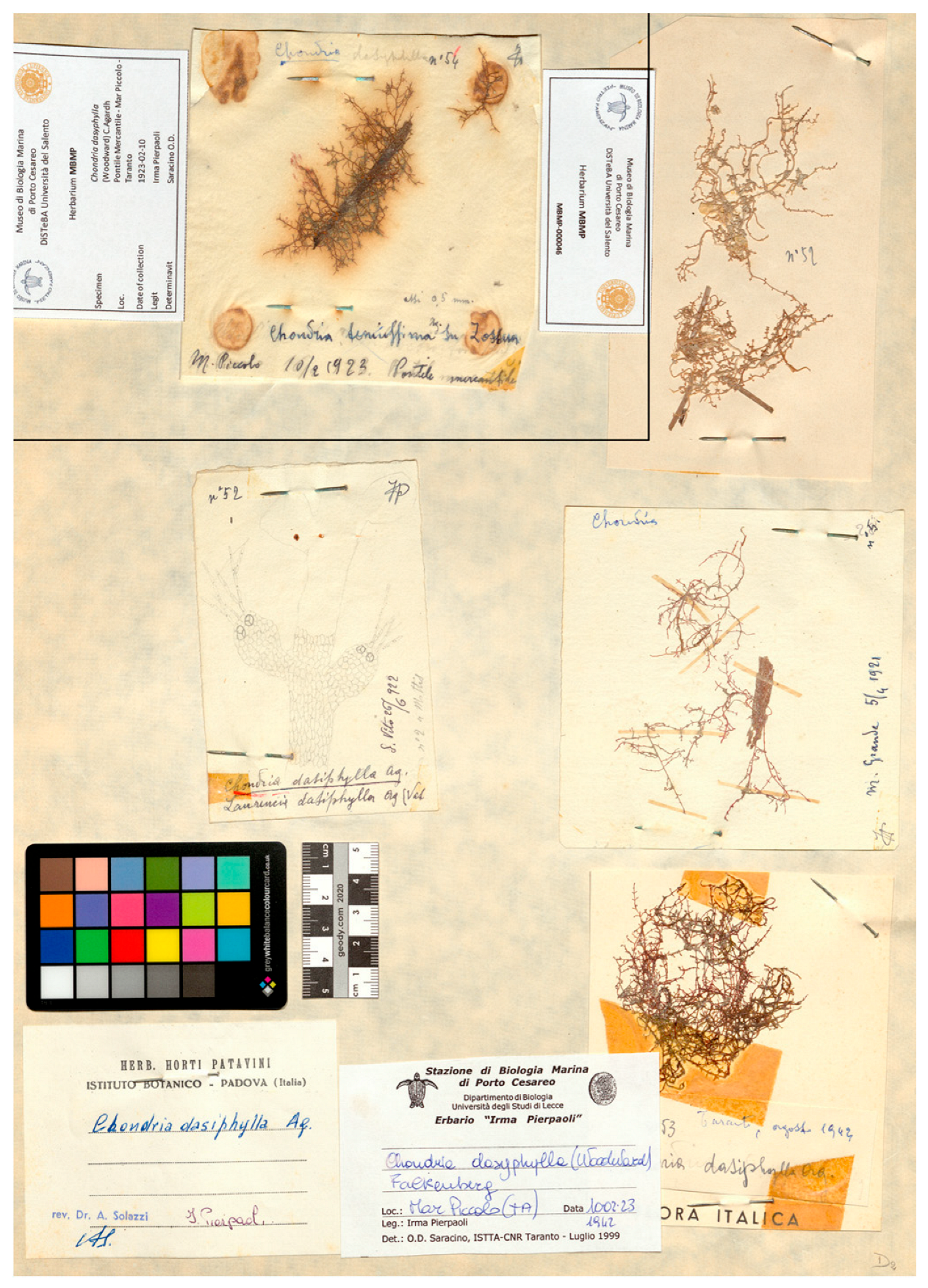 - Cecere, E.; Saracino, O.D. The Irma Pierpaoli (1891–1967) herbarium of the Stazione di Biologia Marina of Porto Cesareo. In The Italian Phycological Patrimony; Abdelahad, N., Ed.; Officine Grafiche Borgia I.G.E.A.: Roma, Italy, 1999; p. 42. [Google Scholar]