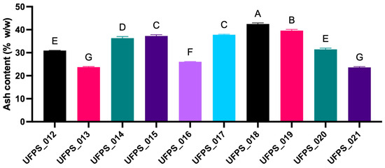 Moreover, the ash content (% w/w, dry basis) by strain, after electrocoagulation–electroflotation (EC/EF), in the range of 25–45% w/w, is depicted in Figure 3. A comparative analysis allows the identification of three bands: an upper band, where UFPS_019 and UFPS_018 presented the highest values (also joined by UFPS_017 and UFPS_016 with values near those with the greatest ash content); an intermediate band with UFPS_012, UFPS_014, UFPS_020, and UFPS_021; and a lower band containing UFPS_013 and UFPS_015, with values lower than those of the set. Additionally, in the statistical comparisons indicated in the figure, no significant differences were found; therefore, at similar concentrations, the variation among organisms was moderate and did not move away from the indicated interval.