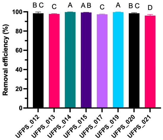 More specifically, UFPS_014, UFPS_015, and UFPS_019 formed the upper group, marked with the letters A or AB, achieving efficiencies close to 100% and constituting the best-performing block. In contrast, UFPS_021 presented the letter D, indicating comparatively lower efficiency, although never below 95%. Moreover, UFPS_012 and UFPS_020 appeared at an intermediate level, both labeled BC, indicating that although they reached high removal percentages, these values did not match the maximum values observed in the leading strains. UFPS_013 and UFPS_017 were assigned to group C, and the arrangement of letters above each bar precisely illustrates the statistical relationships among organisms, demonstrating that the results are not uniform but instead reflect inherent variations in each strain.