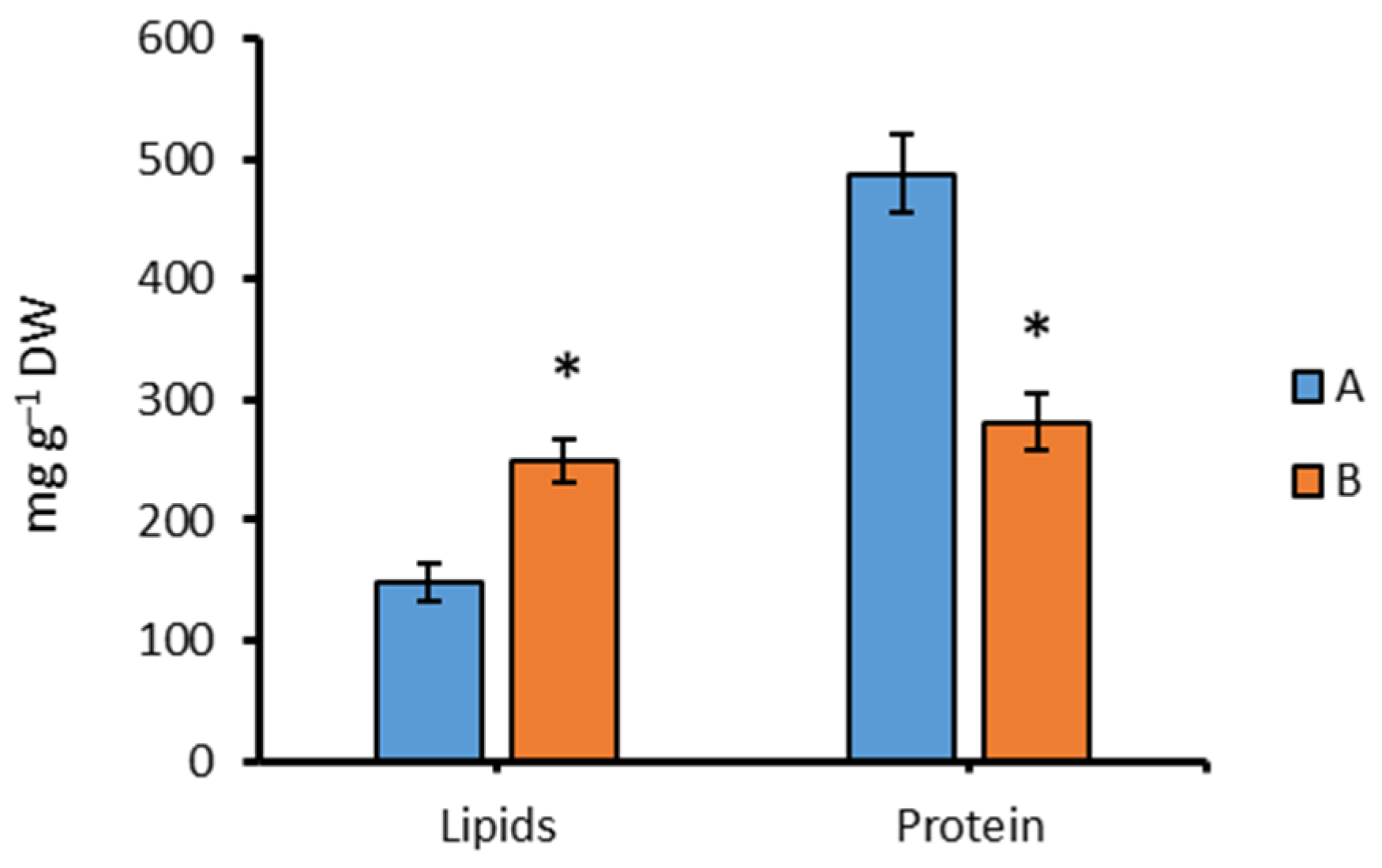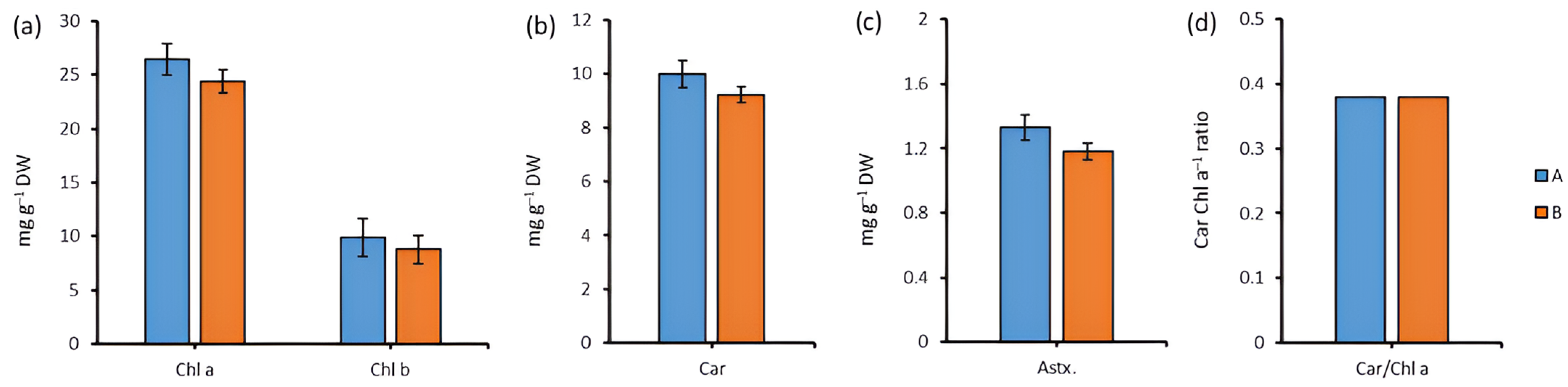 - Maltseva, I.; Yakoviichuk, A.; Maltseva, S.; Cherkashina, S.; Kulikovskiy, M.; Maltsev, Y. Biochemical and antioxidant characteristics of Chlorococcum oleofaciens (Chlorophyceae, Chlorophyta) under various cultivation conditions. Plants 2024, 13, 2413. [Google Scholar] [CrossRef]