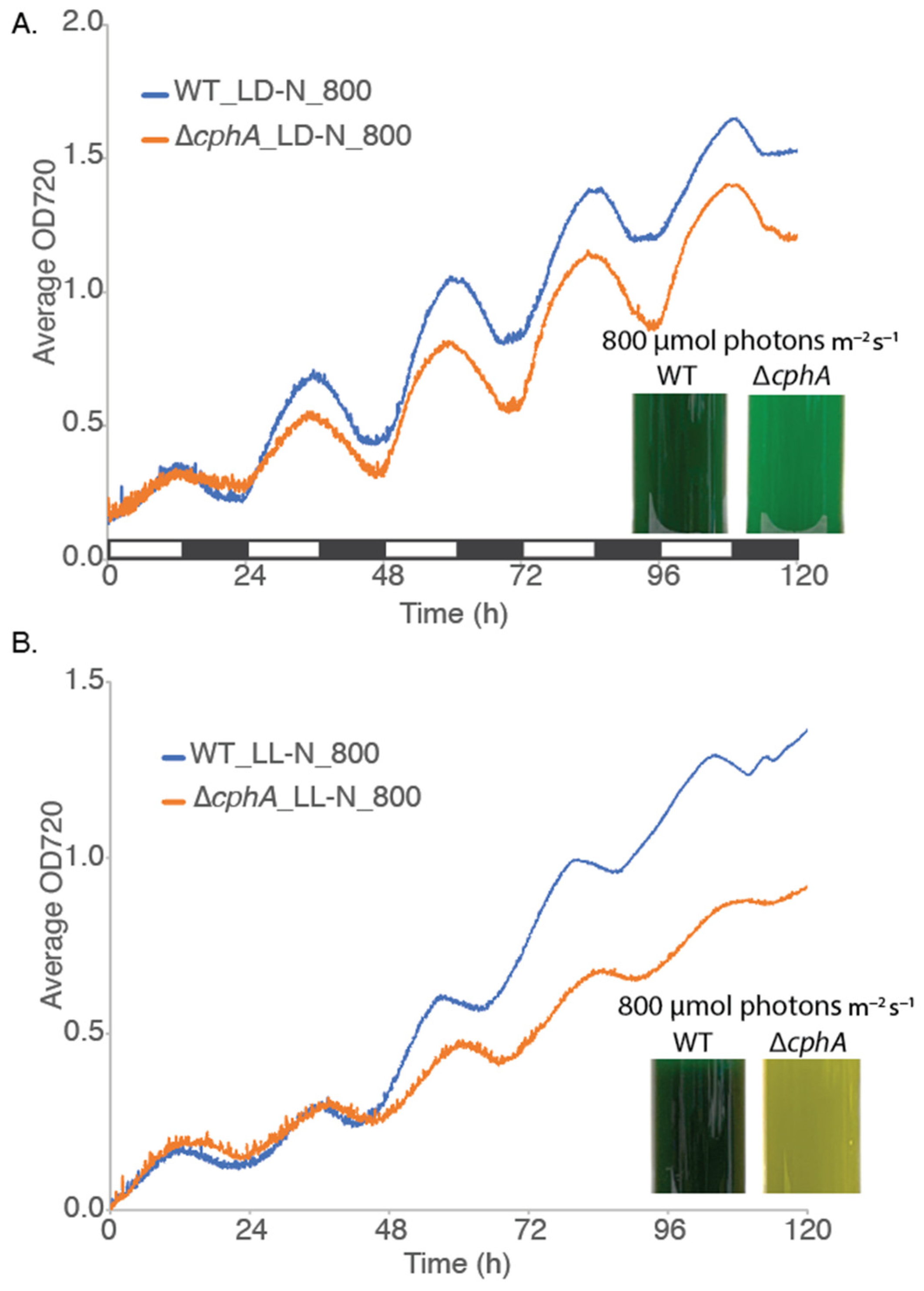 cphA cultures to both LD and LL regimes. The inability to store nitrogen as cyanophycin does not profoundly impact growth of