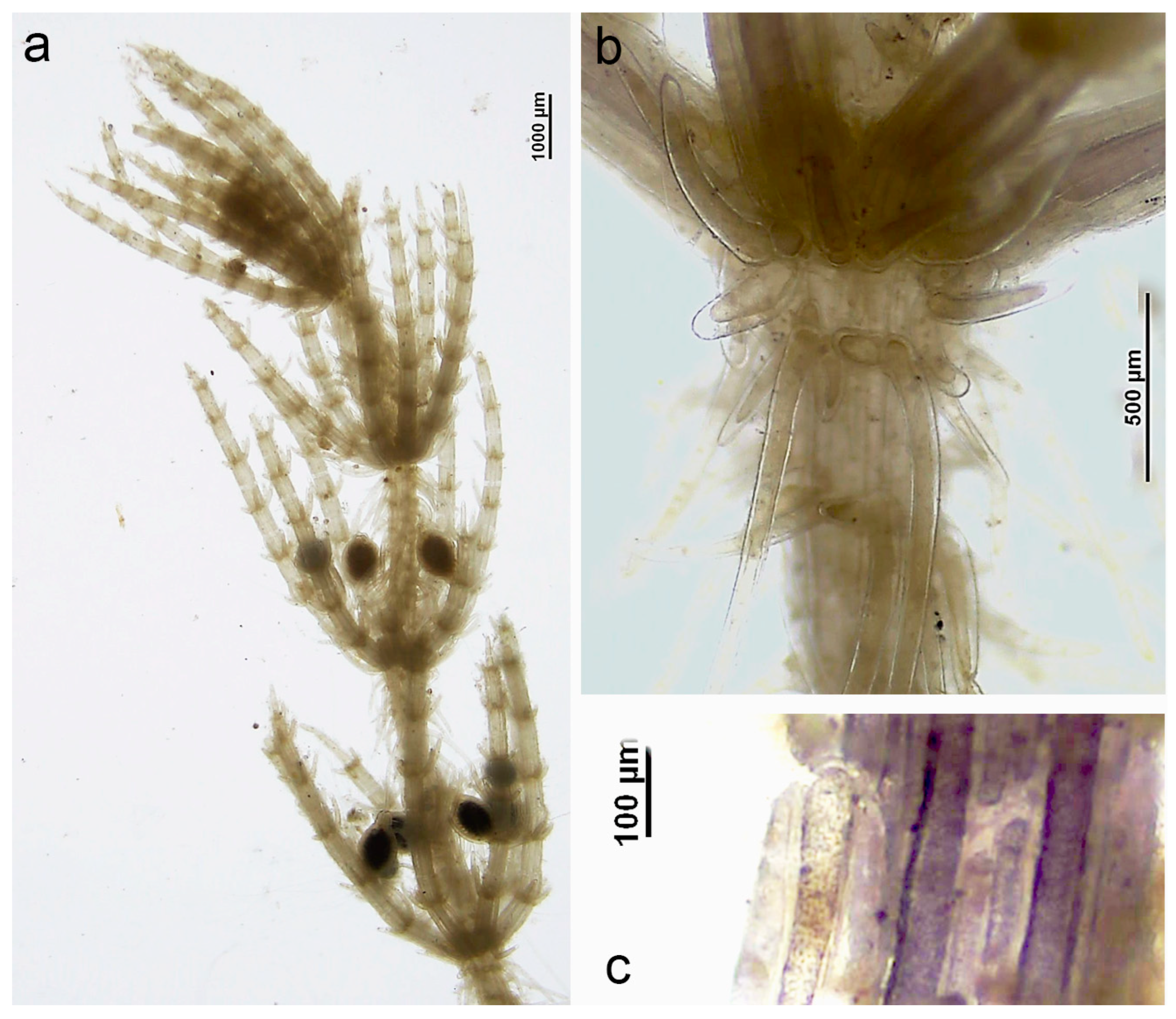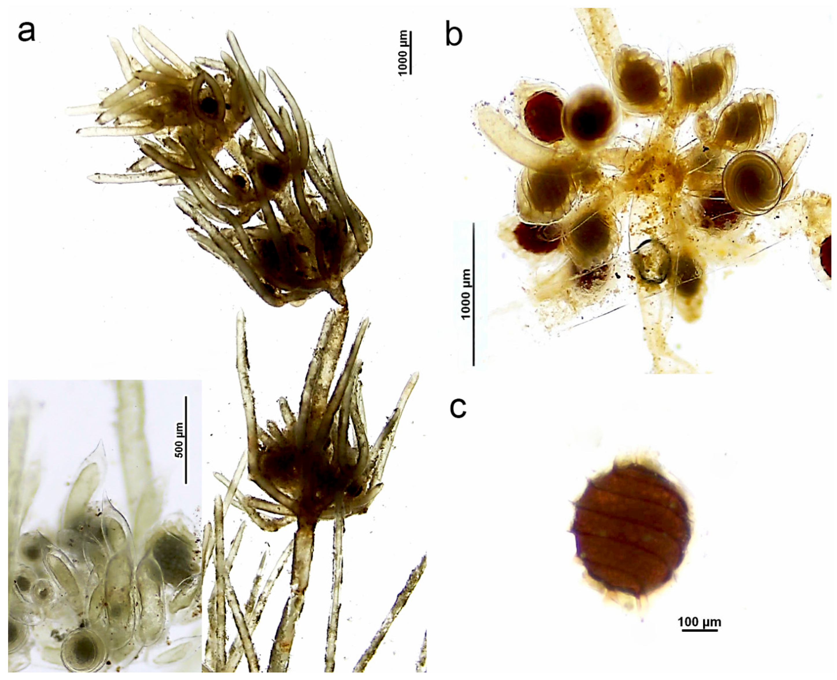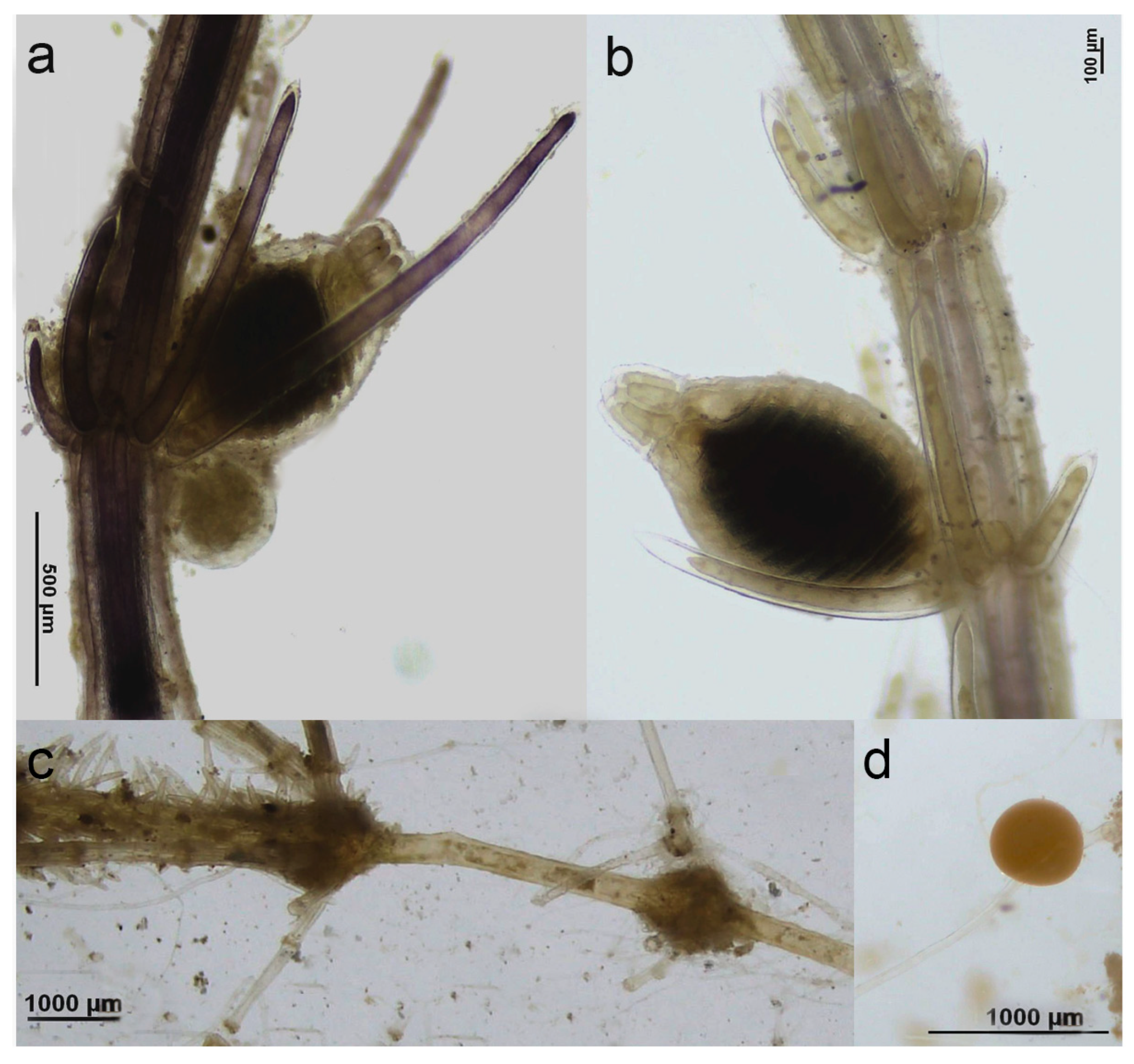 - Romanov, R.; Becker, R.; Iberite, M.; Barinova, S.; Gregor, T.; Mesterházy, A. Chara squamosa. In Charophytes of Europe; Schubert, H., Blindow, I., Nat, E., Korsch, H., Gregor, T., Denys, L., Stewart, N., Weyer, K., Romanov, R., Casanova, M.T., Eds.; Springer Nature: Cham, Switzerland, 2024; pp. 613–625. [Google Scholar] [CrossRef]