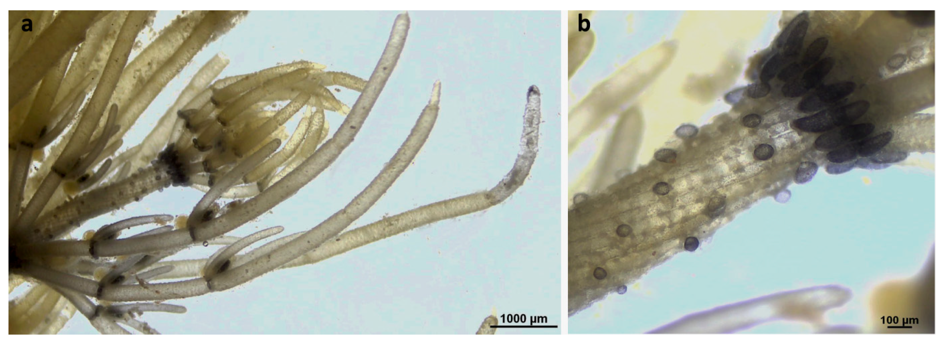 - Pérez, W.; Hall, J.D.; McCourt, R.M.; Karol, K.G. Phylogeny of North American Tolypella (Charophyceae, Charophyta) Based on Plastid DNA Sequences with a Description of Tolypella ramosissima sp. nov. J. Phycol 2014, 50, 776–789. [Google Scholar] [CrossRef]