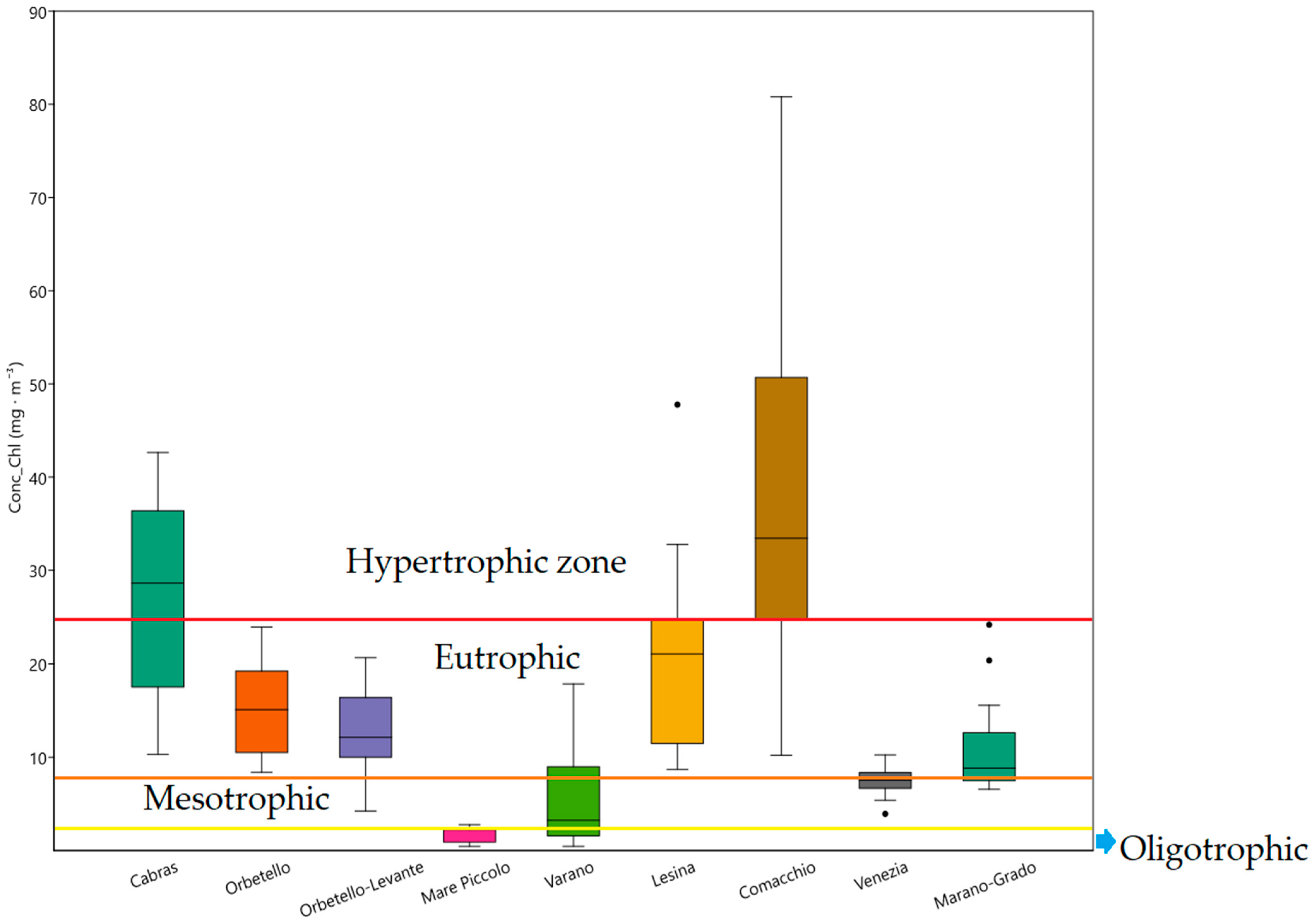 - Acquavita, A.; Aleffi, I.F.; Benci, C.; Bettoso, N.; Crevatin, E.; Milani, L.; Tamberlich, F.; Toniatti, L.; Barbieri, P.; Licen, S.; et al. Annual characterization of the nutrients and trophic state in a Mediterranean coastal lagoon: The Marano and Grado Lagoon (northern Adriatic Sea). Reg. Stud. Mar. Sci. 2015, 2, 132–144. [Google Scholar] [CrossRef]