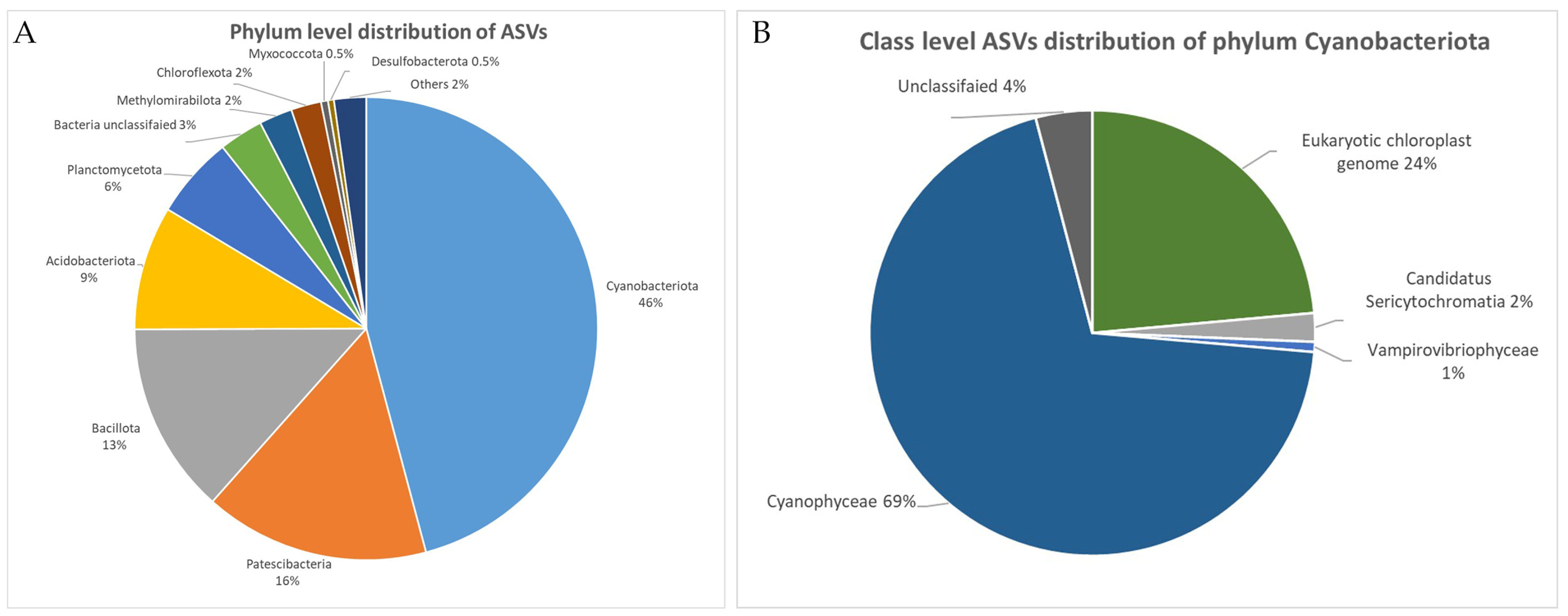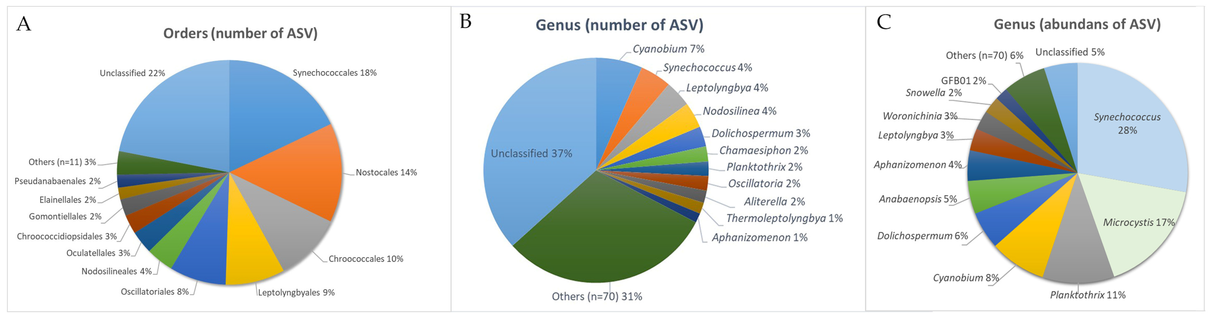 3.3. Distribution and Abundance Cyanobacteria Based on 16S rRNA Gene Metabarcoding