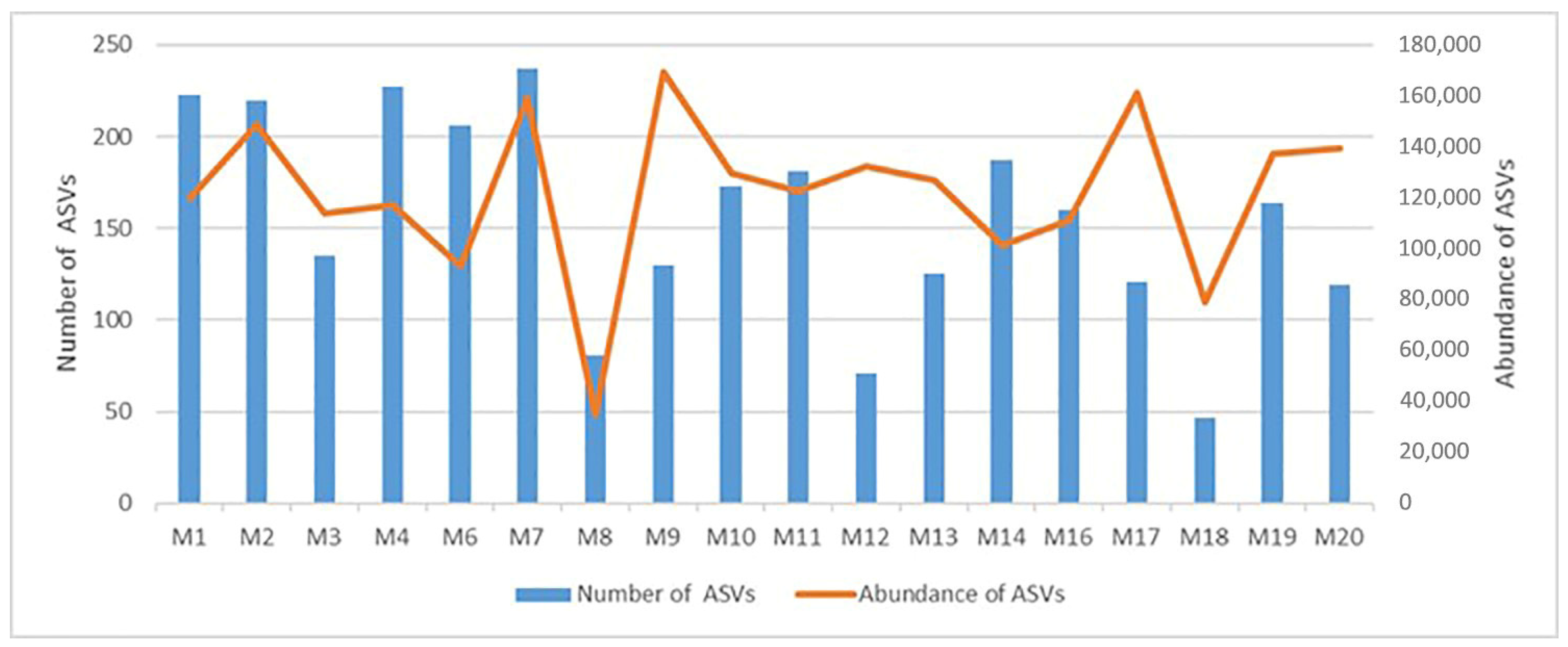 - Using the example of the Argonema galeatum, which is rare for the studied waterbodies, the presence of the taxon at different locations was proved with minimal abundance values of ASV (<0.01%). Due to the very low abundance, the species was not detected during microscopy of the samples, while the Argonema galeatum strain CBMC475m was isolated from the M9 sample [26]. The 16S rRNA sequence region totally matched ASV416 identified as Argonema galeatum and detected in the same sample (M9). This indicates that low abundance sequences should not be neglected during the analysis of metabarcoding data.