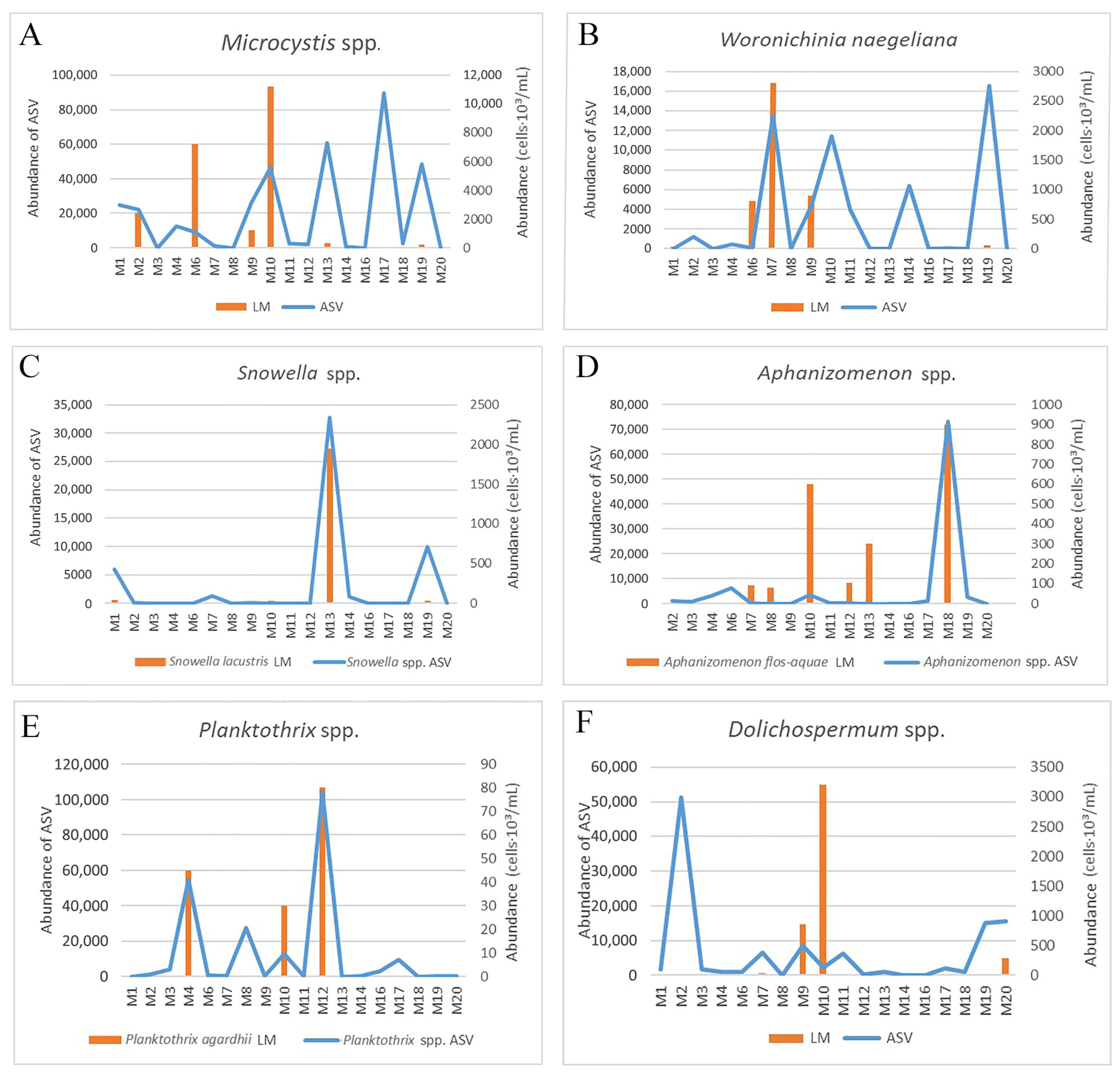 3.5. Comparison of Metabarcoding and Microscopy Data for the Analysis of Diversity and Distribution of Cyanobacteria