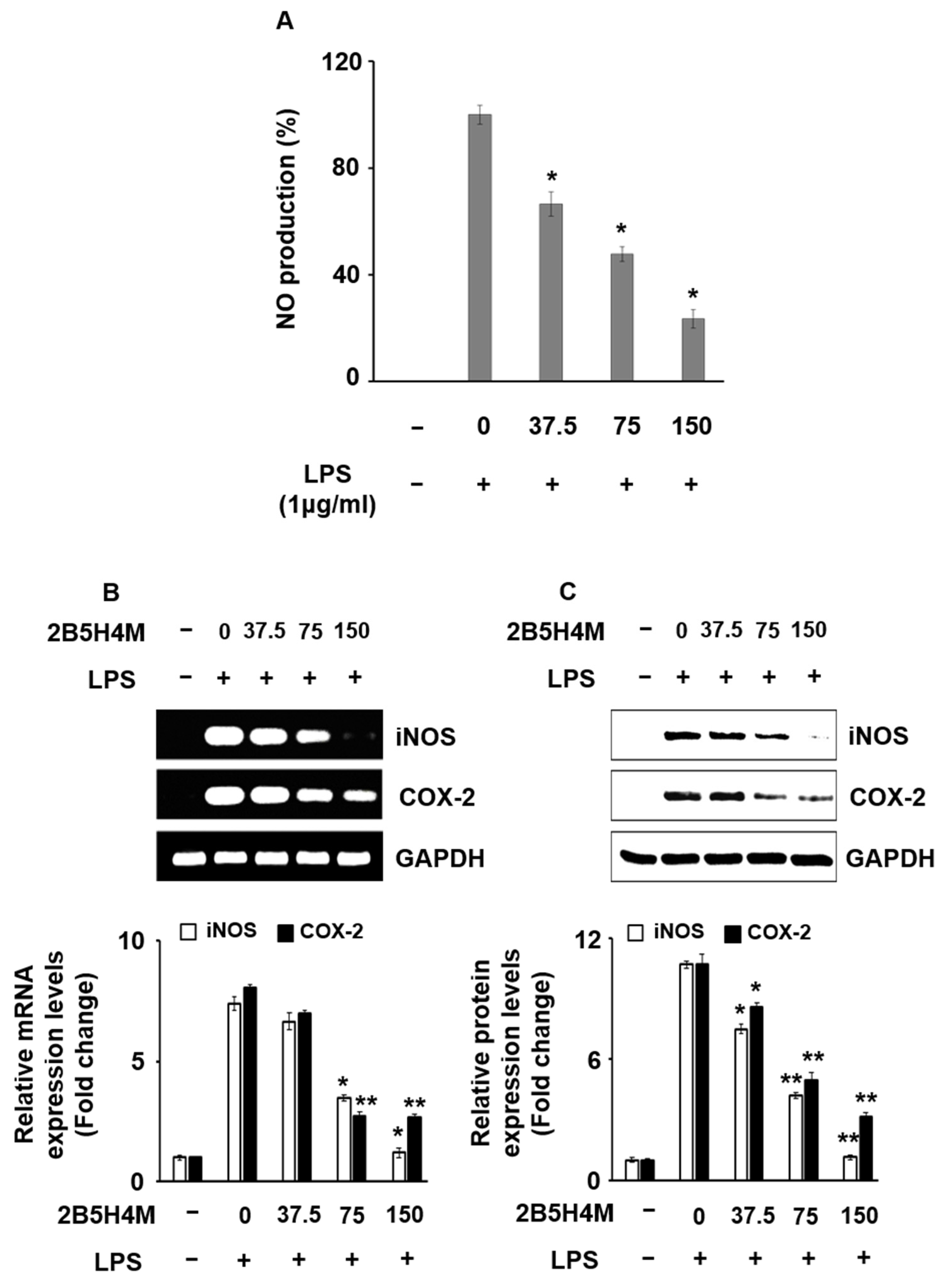3.2. Effect of 2B5H4M on LPS-Stimulated NO Production and iNOS and COX-2 Expression in RAW 264.7 Cells