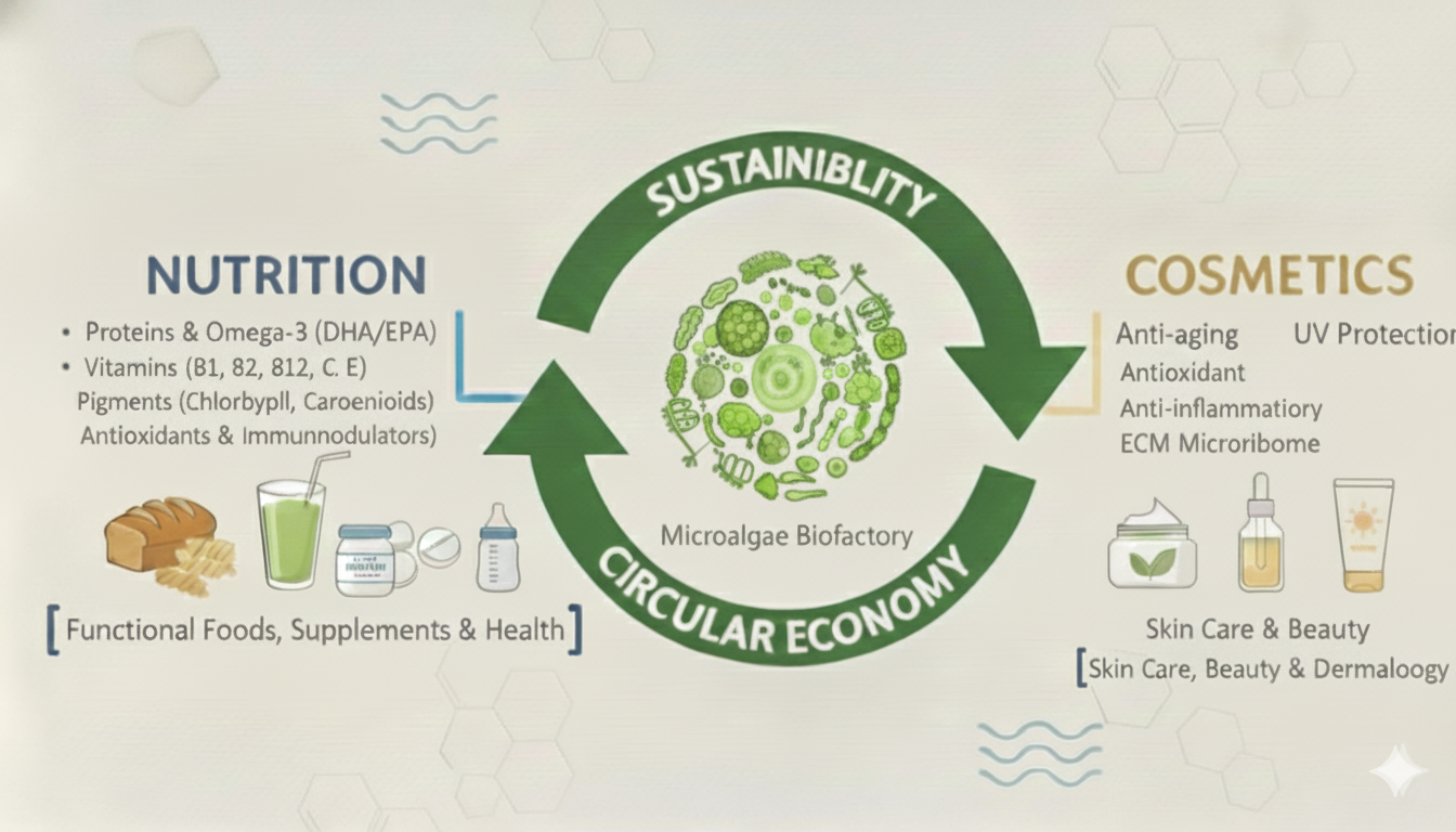 Microalgal Biofactories: Sustainable Solutions for Nutrition and Cosmetics