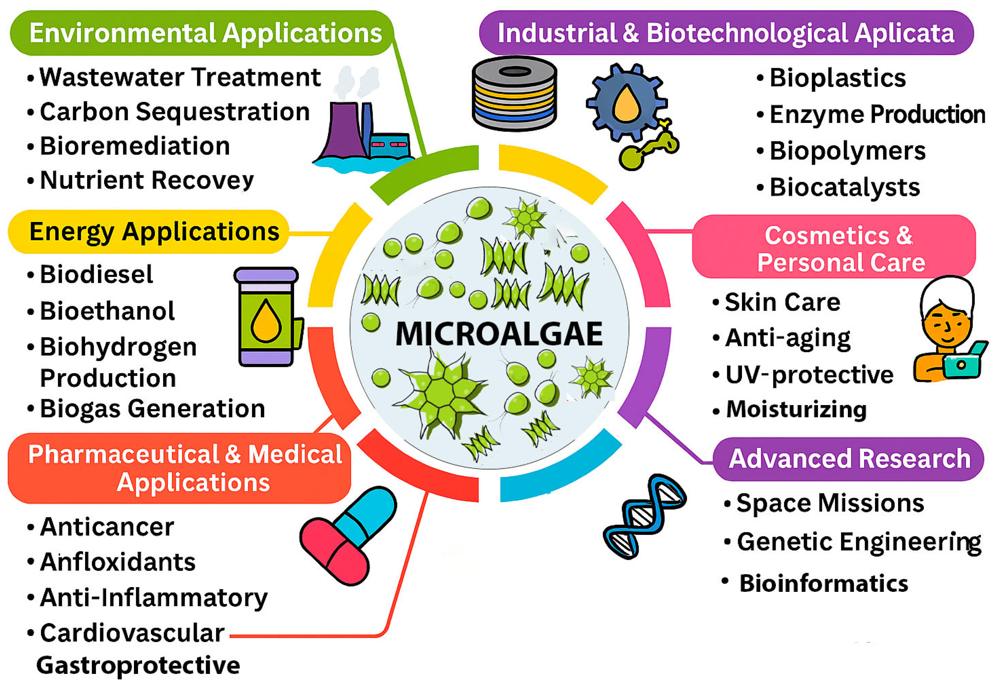 - Ayub, A.; Rahayu, F.; Khamidah, A.; Antarlina, S.S.; Iswari, K.; Supriyadi, K.; Mufidah, E.; Singh, A.; Chopra, C.; Wani, A.K. Harnessing microalgae as a bioresource for nutraceuticals: Advancing bioactive compound exploration and shaping the future of health and functional food innovation. Discov. Appl. Sci. 2025, 7, 389. [Google Scholar] [CrossRef]