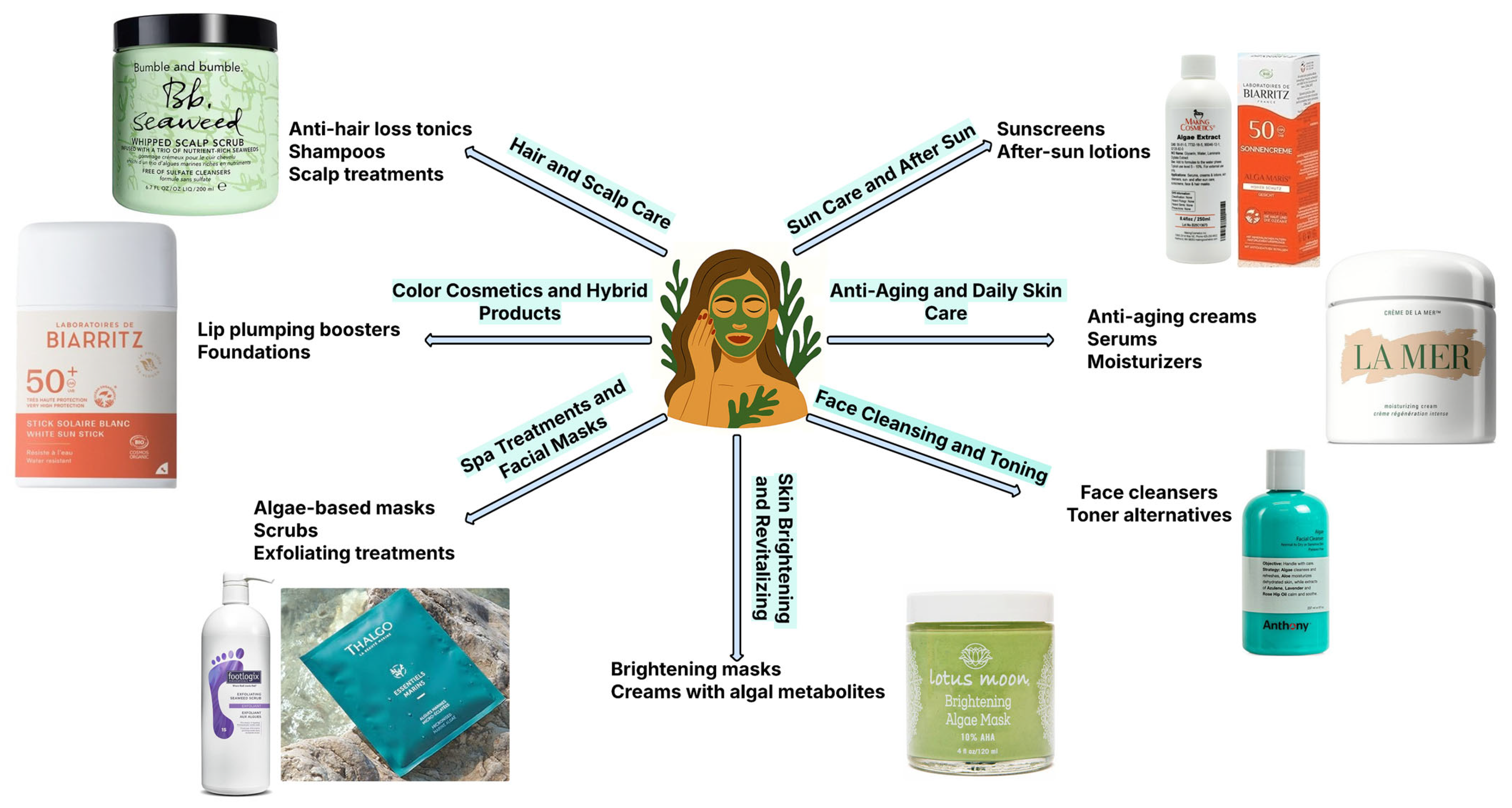 - Mago, Y.; Sharma, Y.; Thakran, Y.; Mishra, A.; Tewari, S.; Kataria, N. Next-generation organic beauty products obtained from algal secondary metabolites: A sustainable development in cosmeceutical industries. Mol. Biotechnol. 2025, 67, 2881–2901. [Google Scholar] [CrossRef]