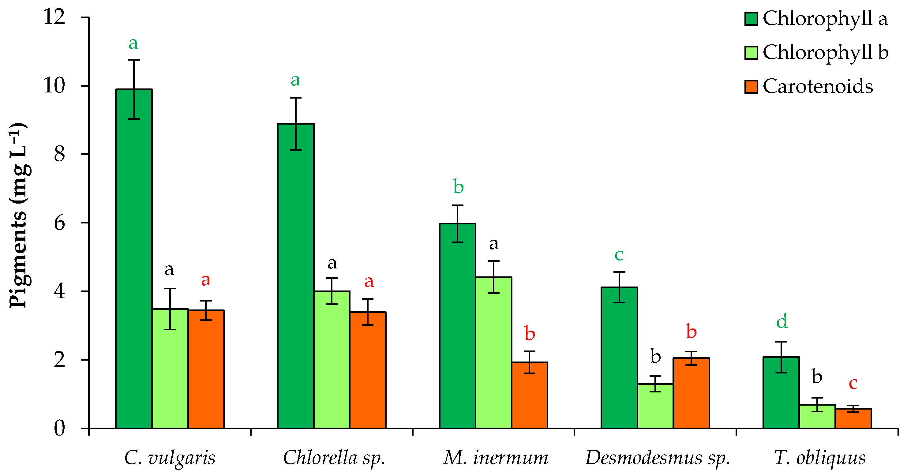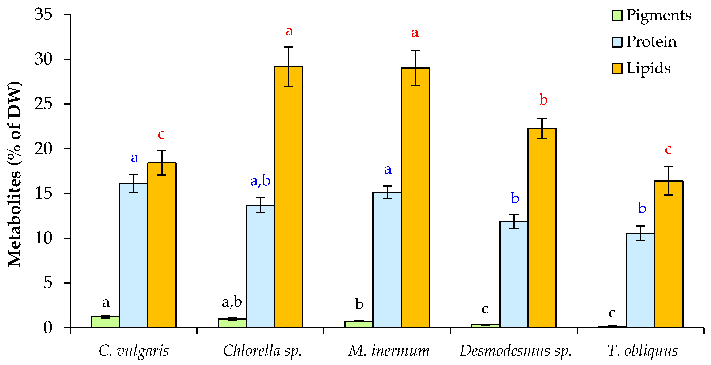 2.4. Evaluation of Pigment, Protein, and Lipid Content
