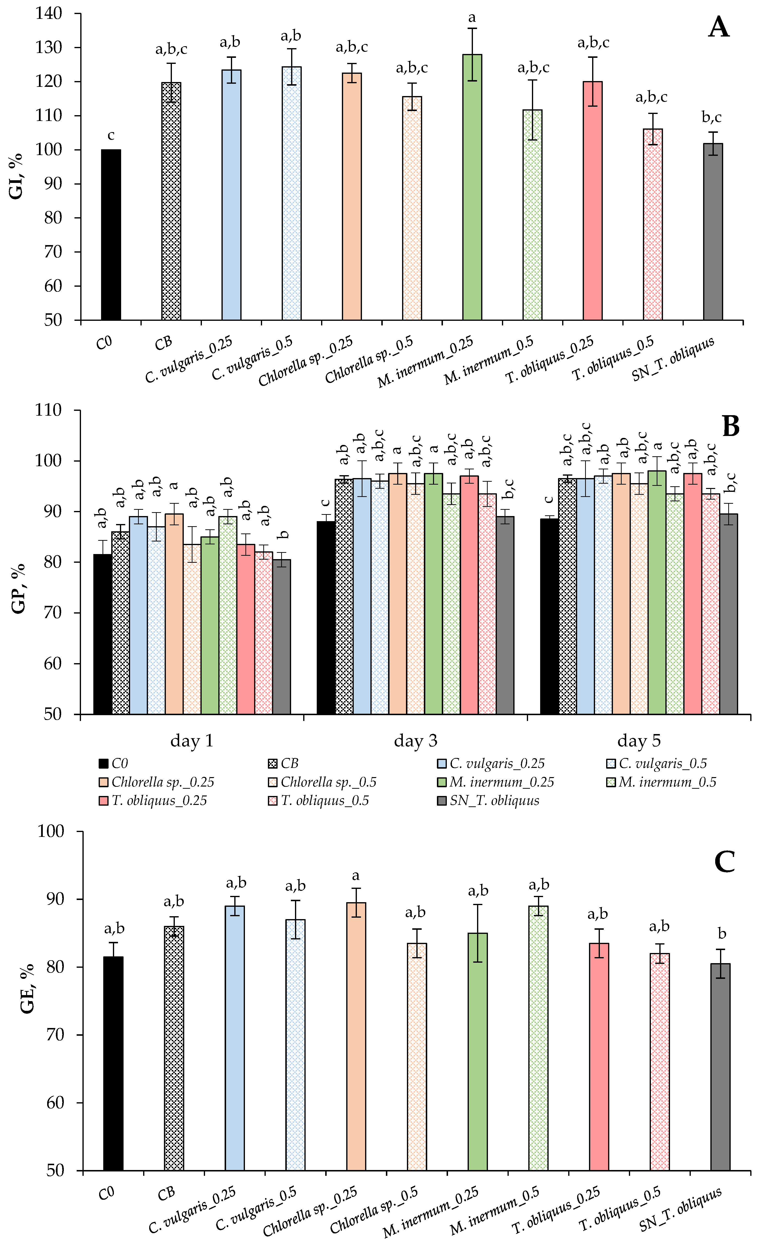 - Puente-Padilla, B.L.; Romero-Villegas, G.I.; Sánchez-Estrada, A.; Cira-Chávez, L.A.; Estrada-Alvarado, M.I. Effect of marine microalgae biomass (Nannochloropsis gaditana and Thalassiosira sp.) on germination and vigor on bean (Phaseolus vulgaris L.) Seeds “Higuera”. Life 2025, 15, 386. [Google Scholar] [CrossRef]