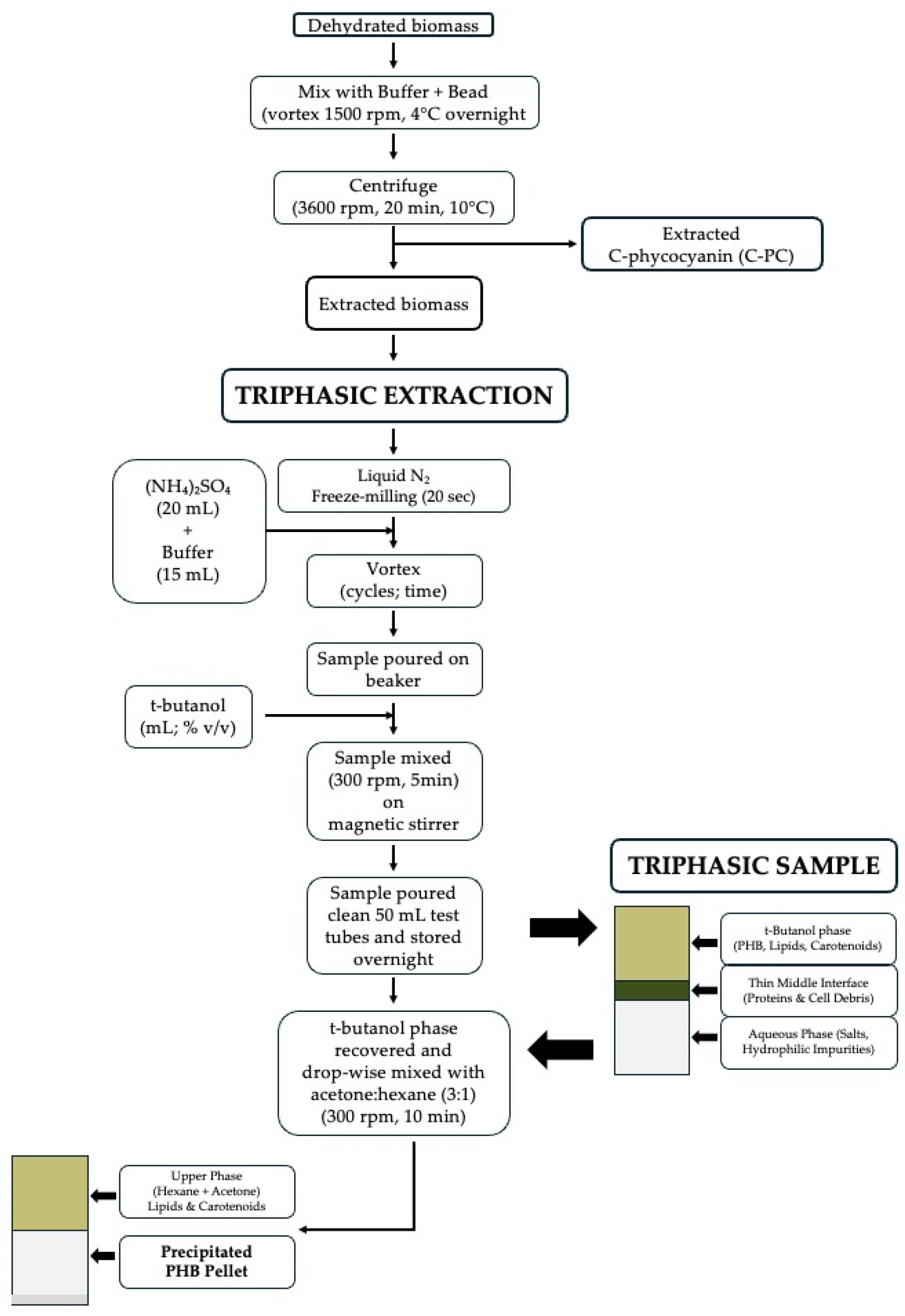 Integrating C-Phycocyanin, and Polyhydroxybutyrate Recovery Using a Triphasic System: Experimental Design and Optimization in Thermotolerant Potamosiphon sp.