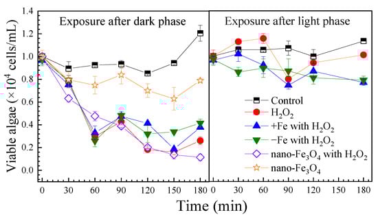 H2O2 exposure caused a rapid decrease in viable algal cells to 3.0 × 103 cells/mL within 60 min, followed by regrowth to 2.6 × 103 cells/mL by 180 min. In the control group, the viable algal cell count increased to 1.2 × 104 cells/mL after 180 min. Neither iron-excess nor iron-depleted treatments enhanced algae inhibition (Figure 1).