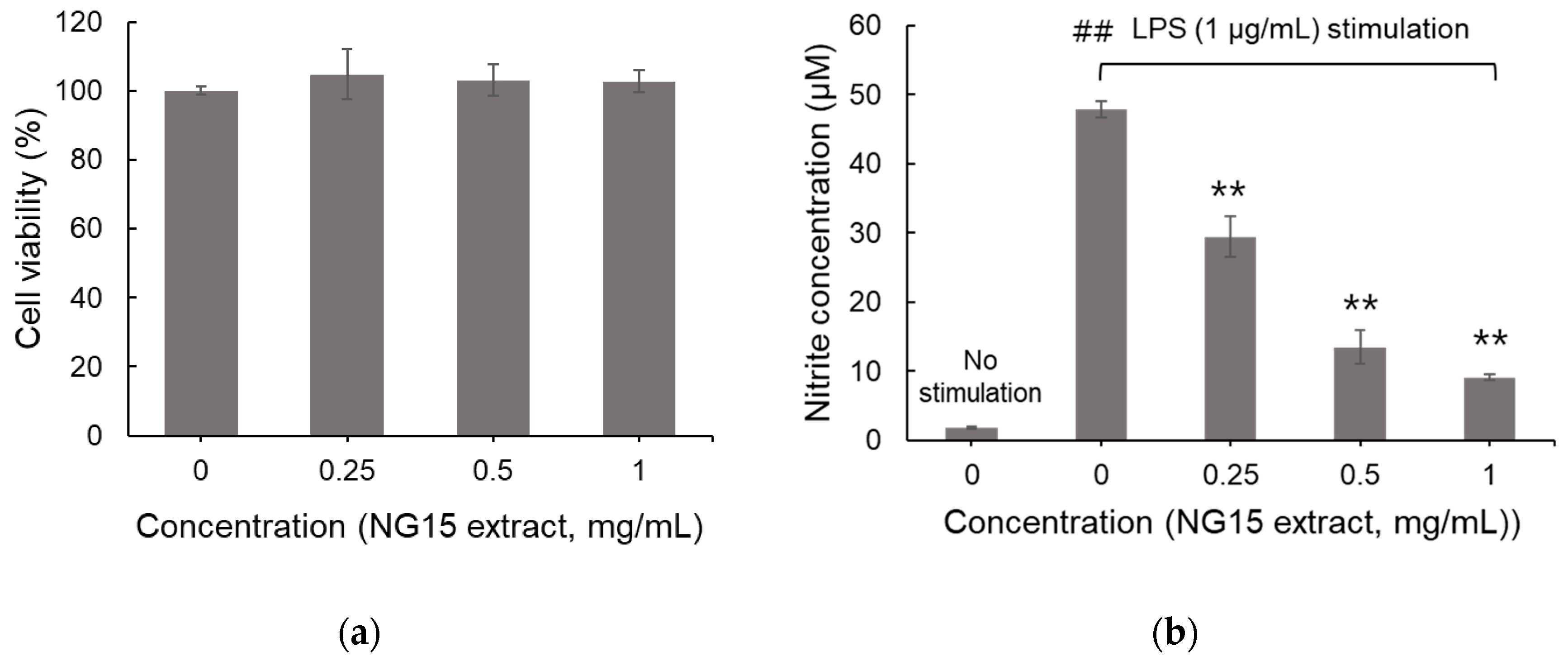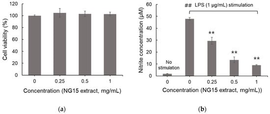 3.2. Effects of NG15 Extract on Cell Viability and LPS-Induced NO Production in RAW 264.7 Cells