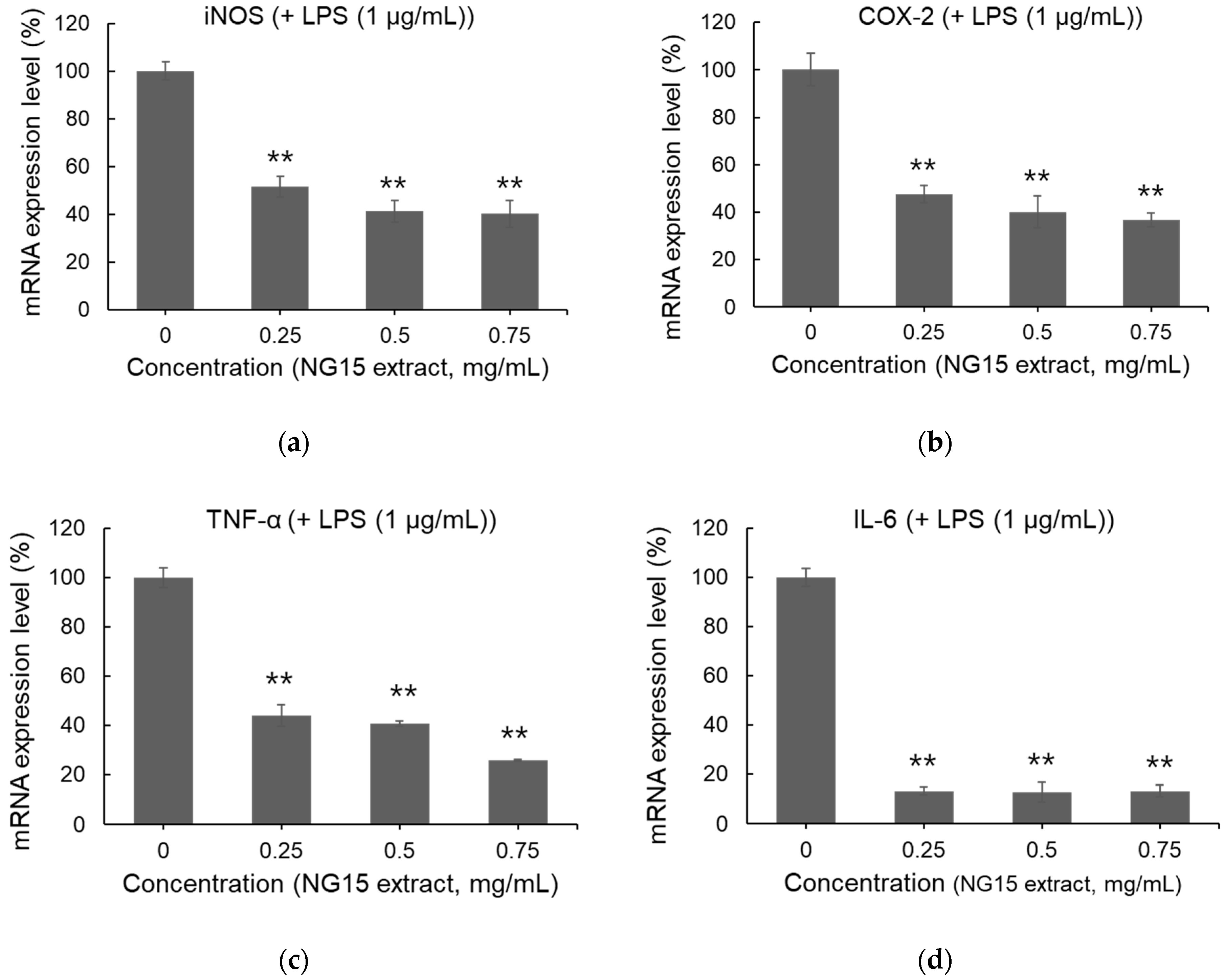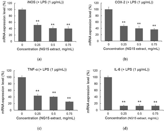 3.3. Effects of NG15 Extract on mRNA Expression of iNOS, COX-2, TNF-α, and IL-6