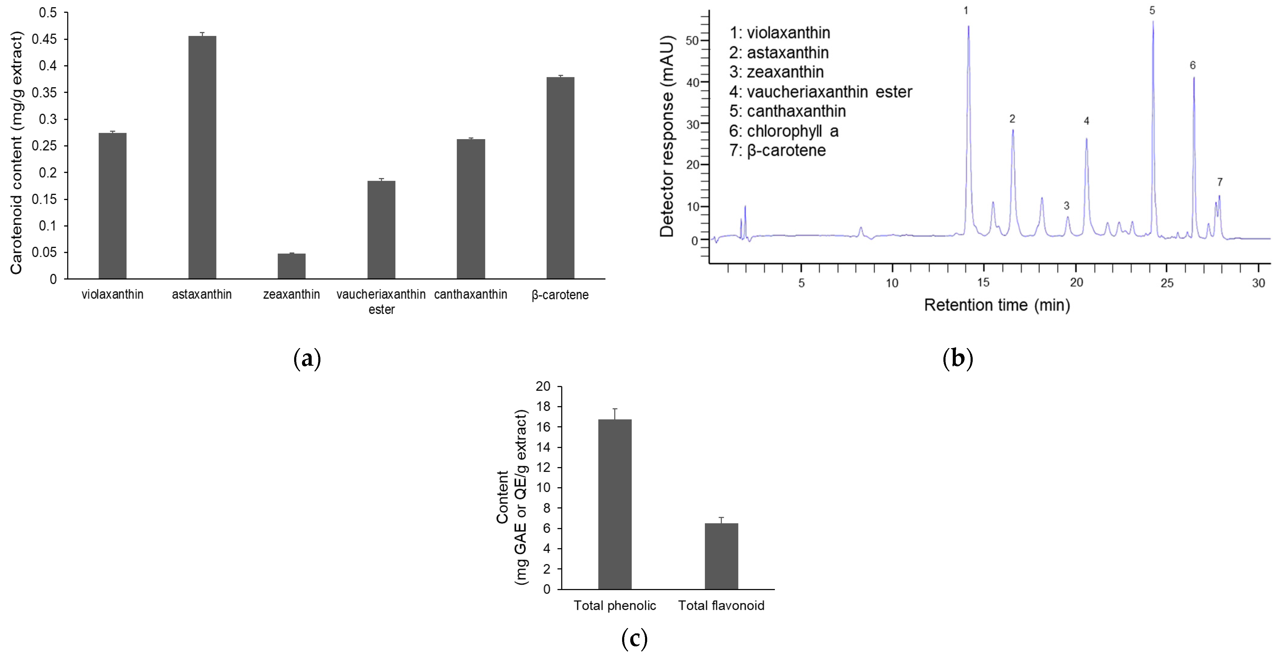 - Haoujar, I.; Cacciola, F.; Abrini, J.; Mangraviti, D.; Giuffrida, D.; Oulad El Majdoub, Y.; Kounnoun, A.; Miceli, N.; Fernanda Taviano, M.; Mondello, L.; et al. The Contribution of Carotenoids, Phenolic Compounds, and Flavonoids to the Antioxidative Properties of Marine Microalgae Isolated from Mediterranean Morocco. Molecules 2019, 24, 4037. [Google Scholar] [CrossRef] [PubMed]