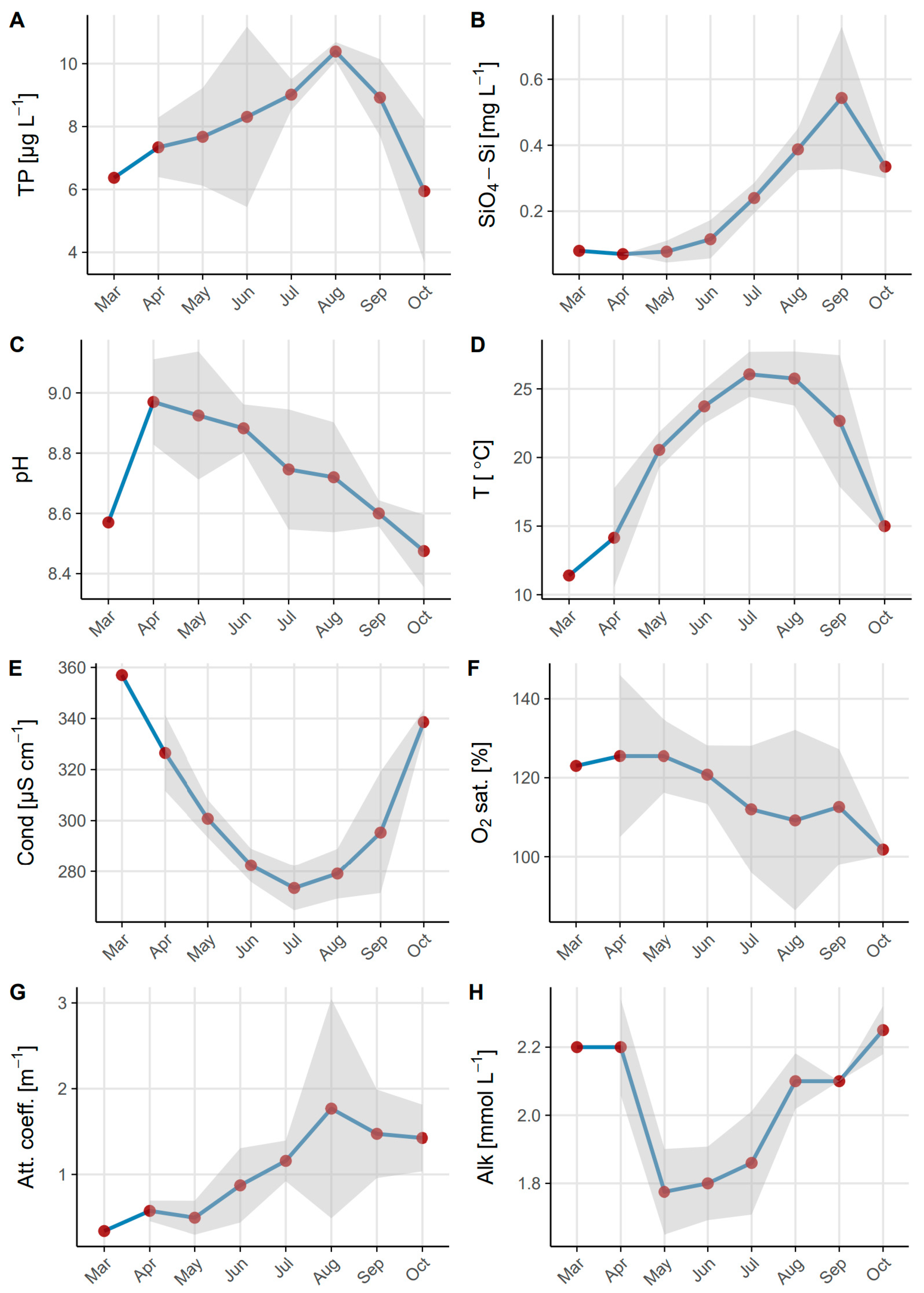 - Dokulil, M.T.; Teubner, K. Long-term adjustment of phytoplankton structure to environmental traits at timescales during lifetime development and over generations. Hydrobiologia 2023, 851, 823–847. [Google Scholar] [CrossRef]