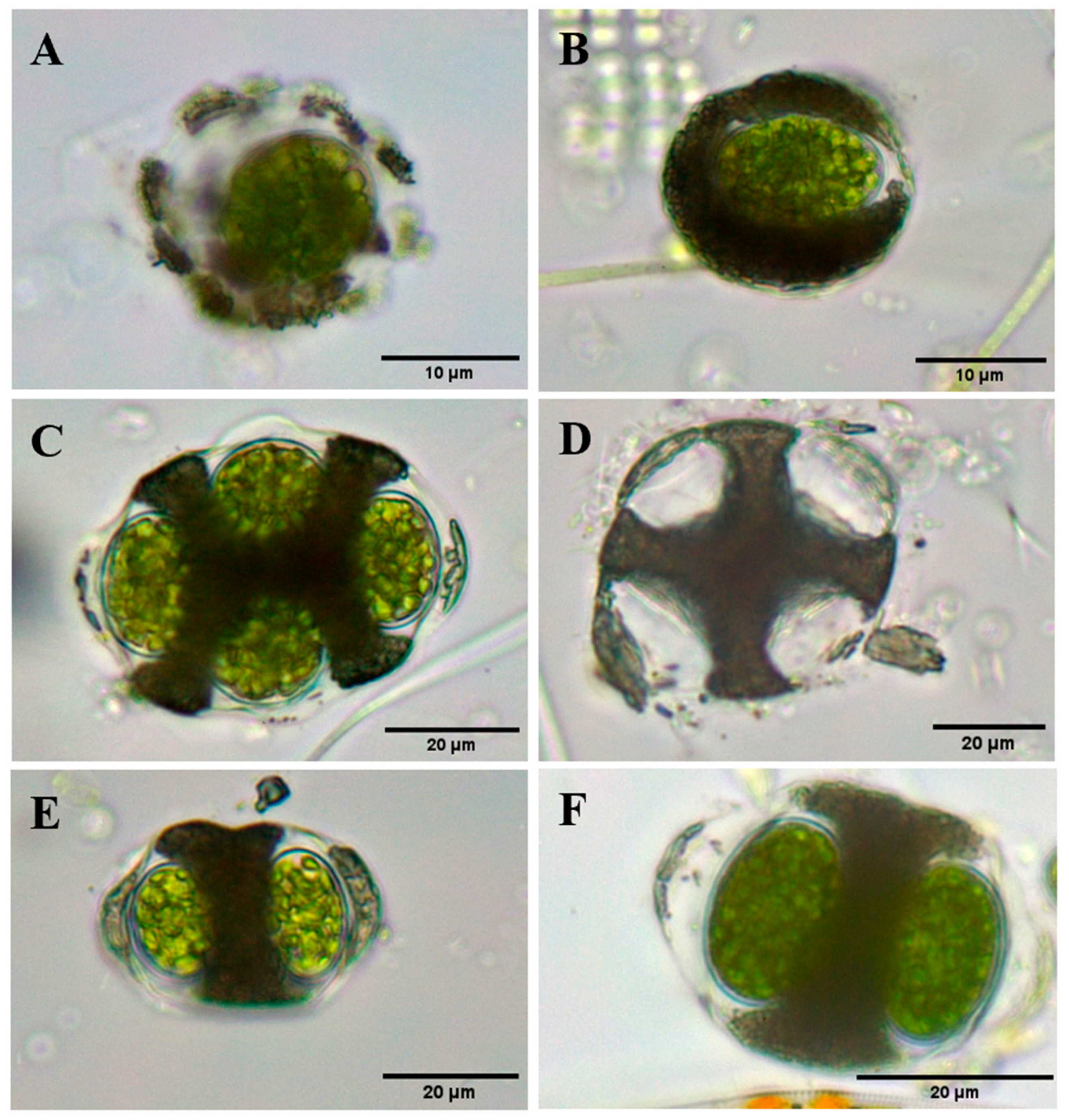 - Komárek, J.; Fott, B. (Eds.) Chlorophyceae (Grünalgen), Ordnung Chlorococcales. 7. Teil, 1. Hälfte; Schweizerbart’sche Verlagsbuchhandlung: Stuttgart, Germany, 1983; Volume XVI, p. 1044. [Google Scholar]