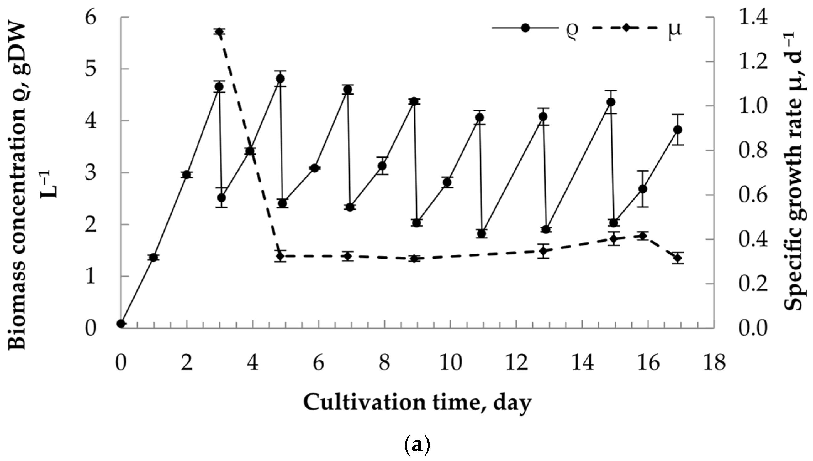 - The biomass productivity for each drainage period was calculated as the difference between the final and initial biomass concentrations, divided by the duration of the period. The specific growth rate was determined for each period using the same approach.