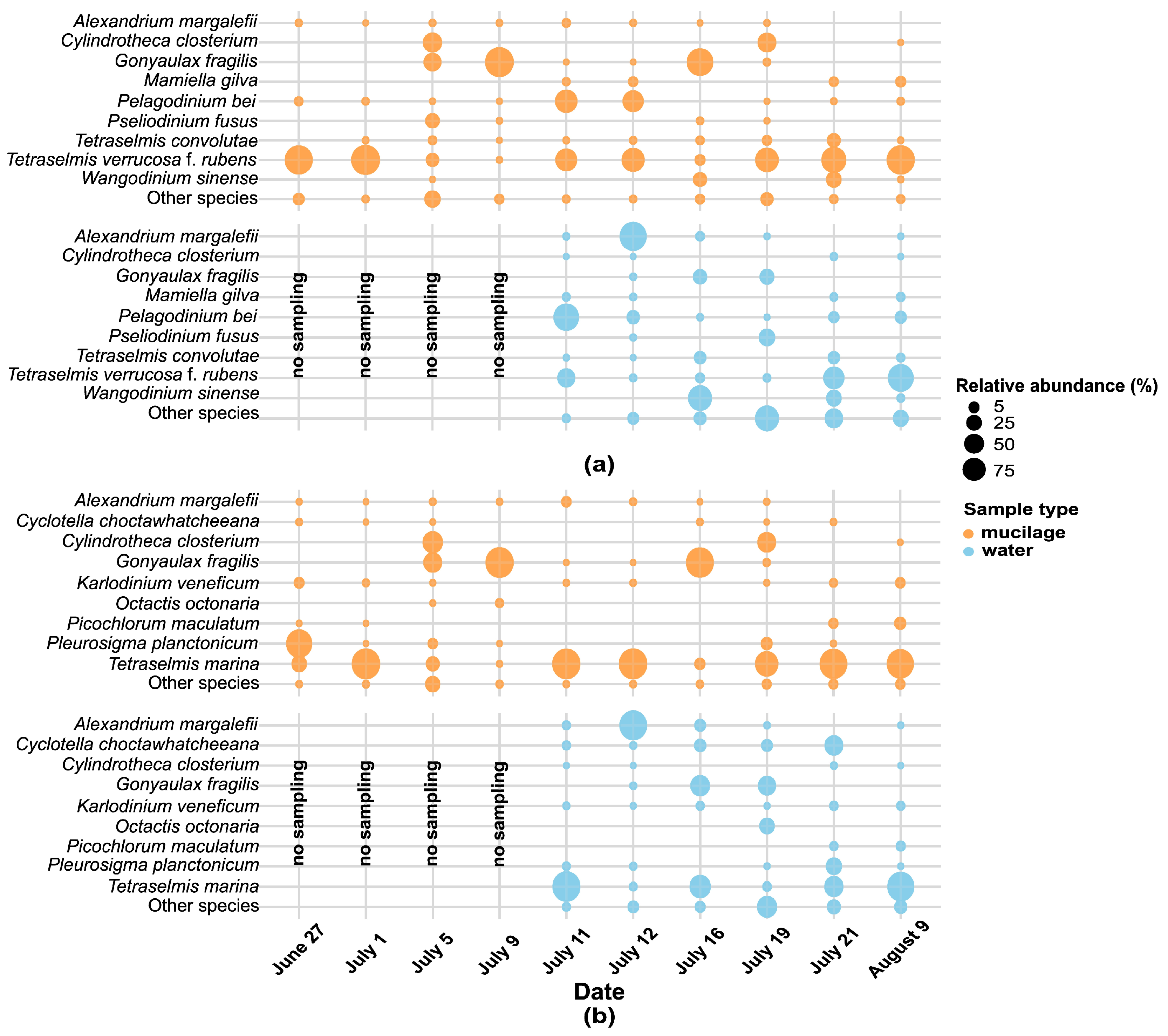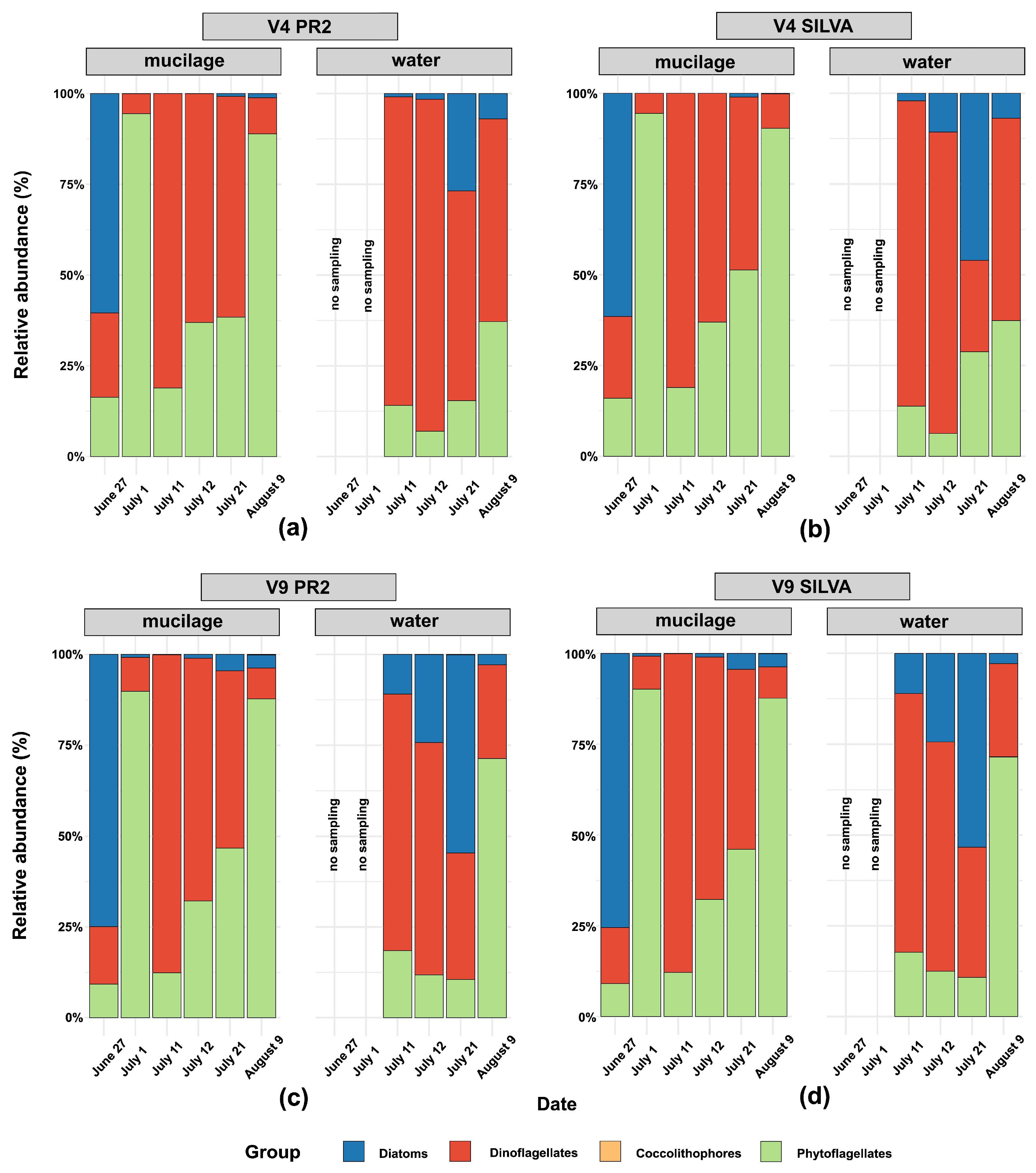 - Akcaalan, R.; Ozbayram, E.G.; Kaleli, A.; Cam, A.O.; Koker, L.; Albay, M. Does environmental DNA reflect the actual phytoplankton diversity in the aquatic environment? Case study of marine mucilage in the Sea of Marmara. Environ. Sci. Pollut. Res. Int. 2023, 30, 72821–72831. [Google Scholar] [CrossRef]