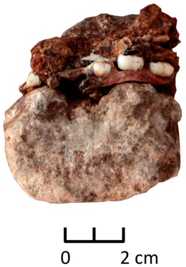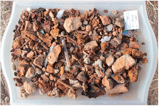 The link between aesthetics and Buried Culture goes deeper. Recently, drawing on Rancière, González-Ruibal pointed out that archaeology and modern art share the same aesthetic regime, one that consists in chaotic juxtapositions. However, while artists produce these juxtapositions through collage, montage, and fragmentation, archaeologists find them in the field, an observation that also holds for students of Buried Culture [] (pp. 91–97). This aesthetic regime, I would like to suggest, communicates the a-social, posthuman condition of Buried Culture, mediated by the intractable confusion of things indiscriminately mixed together: cultural and natural agencies, functional and dysfunctional tools, movable artifacts and immovable features, medical waste and construction debris; everything and anything can partake in it. Consider the item in Figure 2. It comprises three parts: a fragmented brick, dentures, and a base of a tin can. Separately, they are readily identifiable, but fused, they produce a strange, somewhat monstrous, new being. We can work the parts, but the composite whole that emerges from their amalgamation is beyond us. Buried Culture is this same thing writ large. It is an amalgam that flies in the face of functioning social distinctions and order [,,,] (ch. 1).