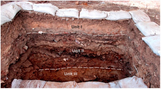 A small 2 × 2 m trench was manually excavated in its northern sector, exposing a 1.8 m deep sequence of cultural deposits (Area A). In section, a range of colors is immediately apparent: brown, red, orange, yellow, grey, black, and various combinations thereof. These color variations are mainly a function of the fine-grain matrix of the layers, attributable to both naturally occurring sediments—quartz sand and reddish-brown loam—and culturally derived ones—ash and rust. Notwithstanding the highly variegated nature of this sequence, it collapses into three major stratigraphic units (Figure 4). The lowest unit (Unit III), approximately 0.8 m thick, superimposes the natural compact hamra soil and is characterized by reddish color, apparently due to high rust content. Above it is Unit II, marked by high ash content that gives it a dark grey shade, and it, too, is approximately 0.8 m thick. Finally, Unit I constitutes a 0.25–0.4 m thick ‘topsoil layer.’ This unit differs from the units below primarily in texture: it is relatively fine-grained and less brittle. Each unit is readily subdivided further into smaller depositional components, demonstrating a much more variegated pattern.