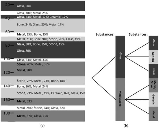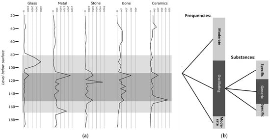 The distribution of densities along the depositional sequence for the different material categories—glass, metal, stone, bone, and ceramics—is presented in Figure 6a. A two-level tripartite division presents itself, first in terms of the distinction between steady and oscillating densities—delineated in Figure 6a in terms of unshaded and shaded areas, respectively—and second in terms of a distinction between oscillations of one substance at a time and oscillations of several substances in concert—presented as light and dark shaded areas, respectively.