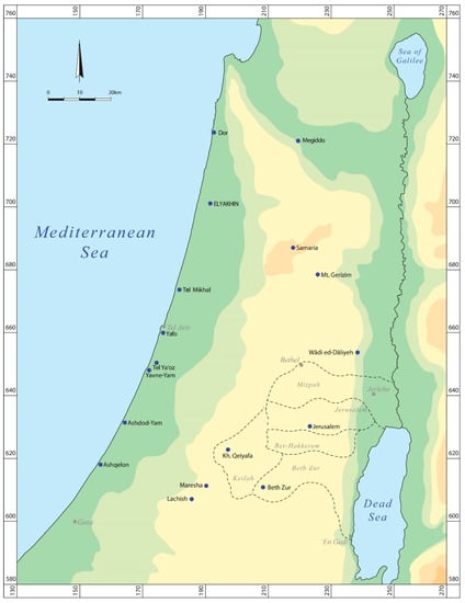 - Ne’eman, Y.; Sender, S.; Oren, E. Map of Mikhmoret (52); Map of Hadera (53); Archaeological Survey of Israel: Jerusalem, Israel, 2000. [Google Scholar]
