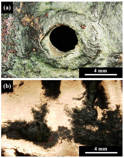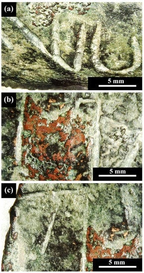 Multifocal LM observation of the copper-alloy tube’s external surface before it was sanded revealed several colours of minerals, including bright green-yellow, dark green, white, black, and brown-red. The green colour may be attributed to atacamite, Cu2Cl(OH)3, and/or brochantite, Cu4SO4(OH)6; the black colour to tenorite, CuO; and the brown-red colour to cuprite, Cu2O [36,40].