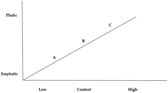 Relationship between high context communication and phatic communication. Point A is American culture circa 1960. B is current American culture. C reflects current Asian cultures.