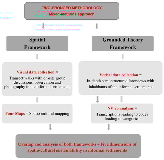 The mixed-methods approach builds on two frameworks which are respectively adapted for visual and verbal data collection, namely the spatial framework and grounded theory. We refer to this as a two-pronged approach (see Figure 1) with the aim to collect socio-spatial data to fully investigate the dimensions of the informal settlements, their attributes and the stakeholders involved as drivers of change. The visual data aid in collecting spatial information and the verbal data aim at gathering spatio-cultural information.