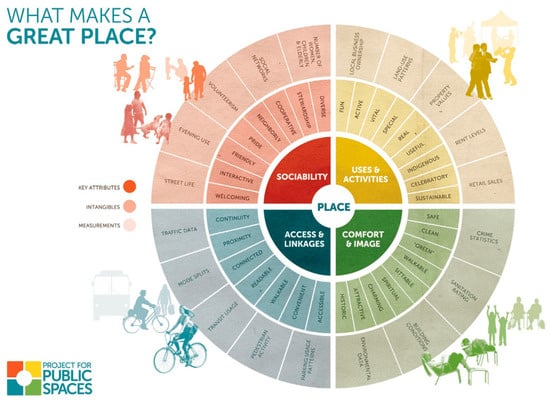 Place diagram developed by Project for Public Spaces (PPS). Note—Project for Public Spaces, n.d. (https://www.pps.org/article/grplacefeat accessed on 2 May 2020). Copyright—granted.