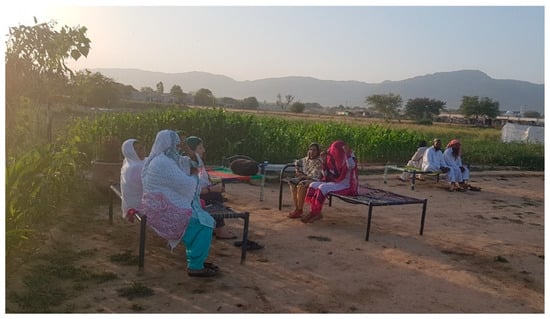 Figure 5 depicts the casual environment in which interviews were conducted. Interviewees from different gender, age, employment and social clusters were deliberately selected to cover a diverse range of the populace. However, the governing factor in sampling was the willingness of respondents and convenience of access. The interviews were conducted over a period of two months and multiple trips to the sites along with the community gatekeeper—an influential and trusted local resident who, through their existing networks, provided access to other people active in the neighborhoods within the settlement []. The majority of the interviews were in group settings with participants across different age groups. Both, women and men participated in these interviews, and occasionally children were also present. We were not looking for a demographic representation across a diverse cross-section of the population, e.g., according to age, gender, occupation or class status, as some of these characteristics are not apparent or redundant in a group setting. It was impossible to capture the overall cultural make-up of the informal settlements. Not all trips were successful, but since each visit and interview lasted approximately 40–60 min, it was feasible to visit as per the preference of the residents and availability of the gatekeeper.