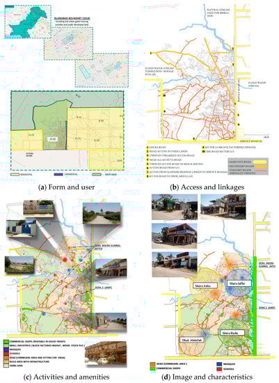 Socio-cultural maps were prepared from the information gathered during the transect walks for further analysis of the informal neighborhoods’ spaces and to explore potential placemaking interventions. The aim of these maps is to record the flow of people and invisible elements of a place, particularly those which other visual data collection methods, such as photography, cannot capture. These maps depict the data gathered during the transect walks along with the physical elements of the place. The maps were prepared with the help of geographical information system (GIS) software, i.e., ArcGIS, Google Earth, AutoCAD and Photoshop software, and supported with on-site photography.